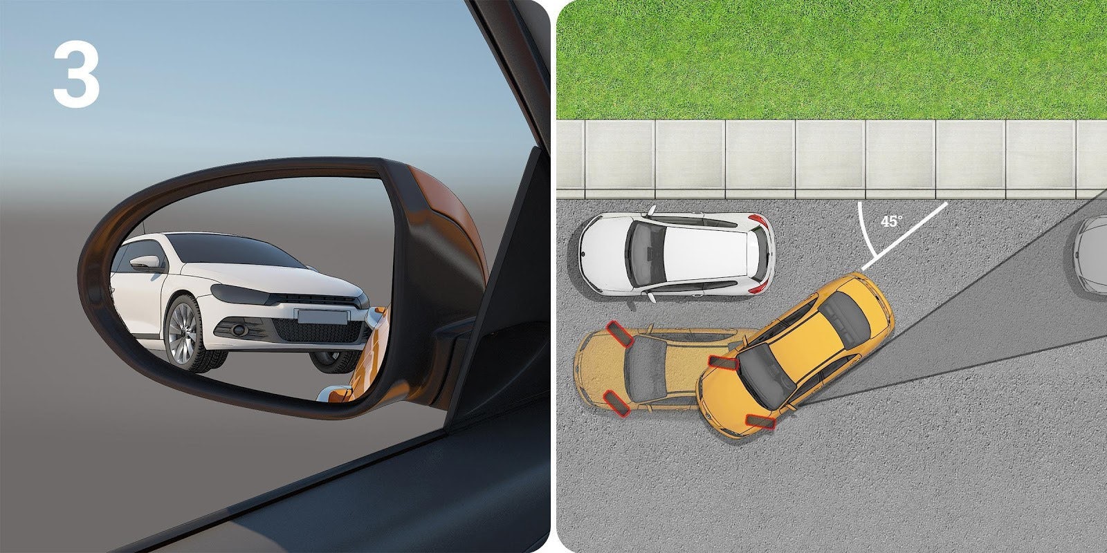 4. Tournez les roues droites et reculez jusqu'à ce que votre rétroviseur droit recouvre le feu arrière du véhicule qui précède.