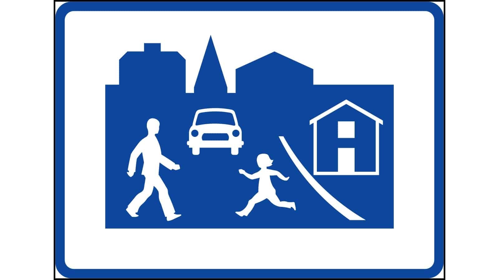 Gångfartsområde. Denna skylt anger ett gångfartsområde där motordrivna fordon endast får färdas i gånghastighet, dvs. ca 5-7 km/h. Det är ofta många fotgängare och barn i gångfartsområden, så det är mycket viktigt att du kör försiktigt och är uppmärksam.