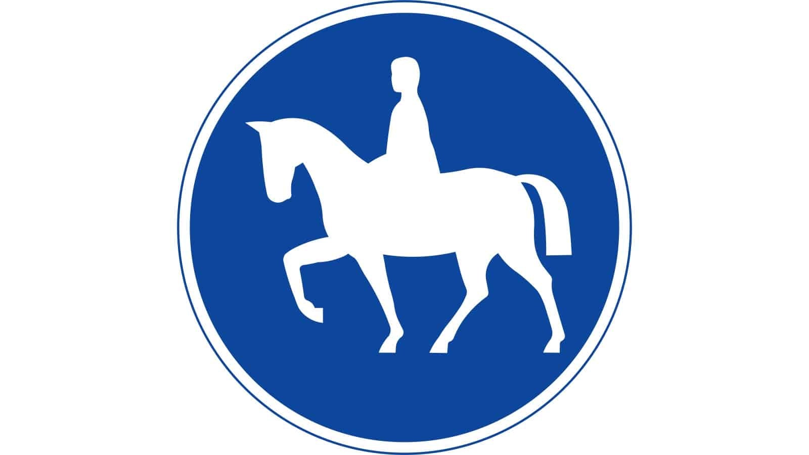 Ridväg. Detta påbudsmärke innebär tyvärr inte att du möter en snäll häst utan att du bör vara uppmärksam för hästar nära eller på vägen. Trafikmärket innebär en påbjuden ridväg. Glöm inte bort att fotgängare också är tillåtna på en ridväg.