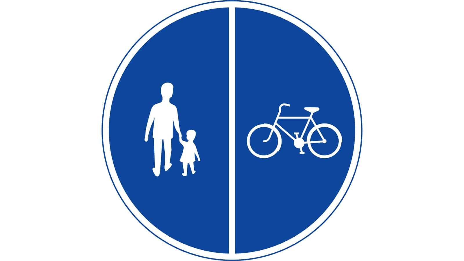 Delad gång- och cykelbana med skiljelinje. Denna påbudsskylt anger en delad gång- och cykelbana som delas av en linje. Håll utkik för cyklar som kan komma i hög fart och fotgängare. Detta är speciellt viktigt vid korsningar eller utfarter.