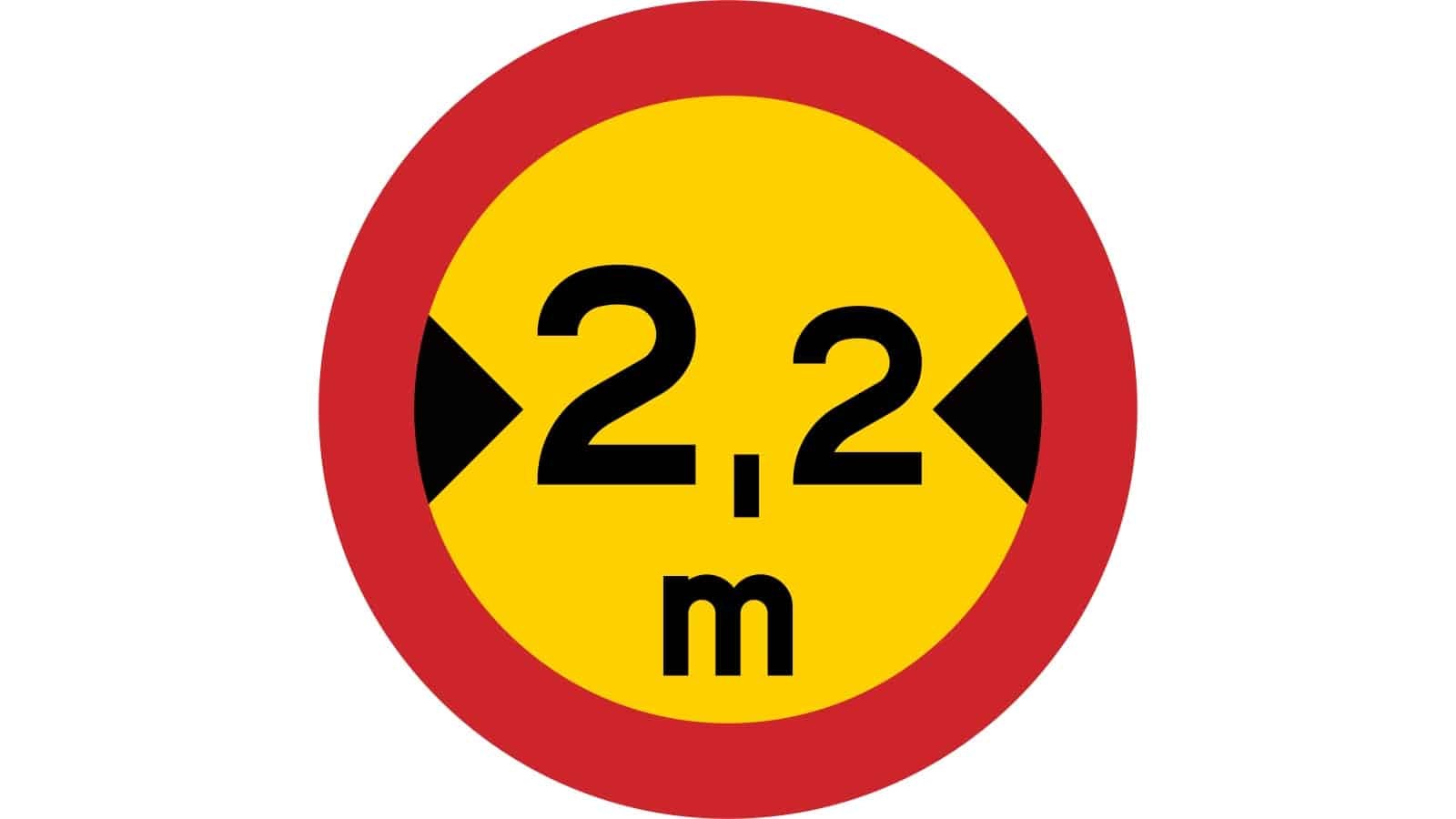Förbud mot fordonsbredd. Skylten anger den maximala bredden ett fordon får ha. Är fordonet bredare än angivelserna på skylten får det inte passera.