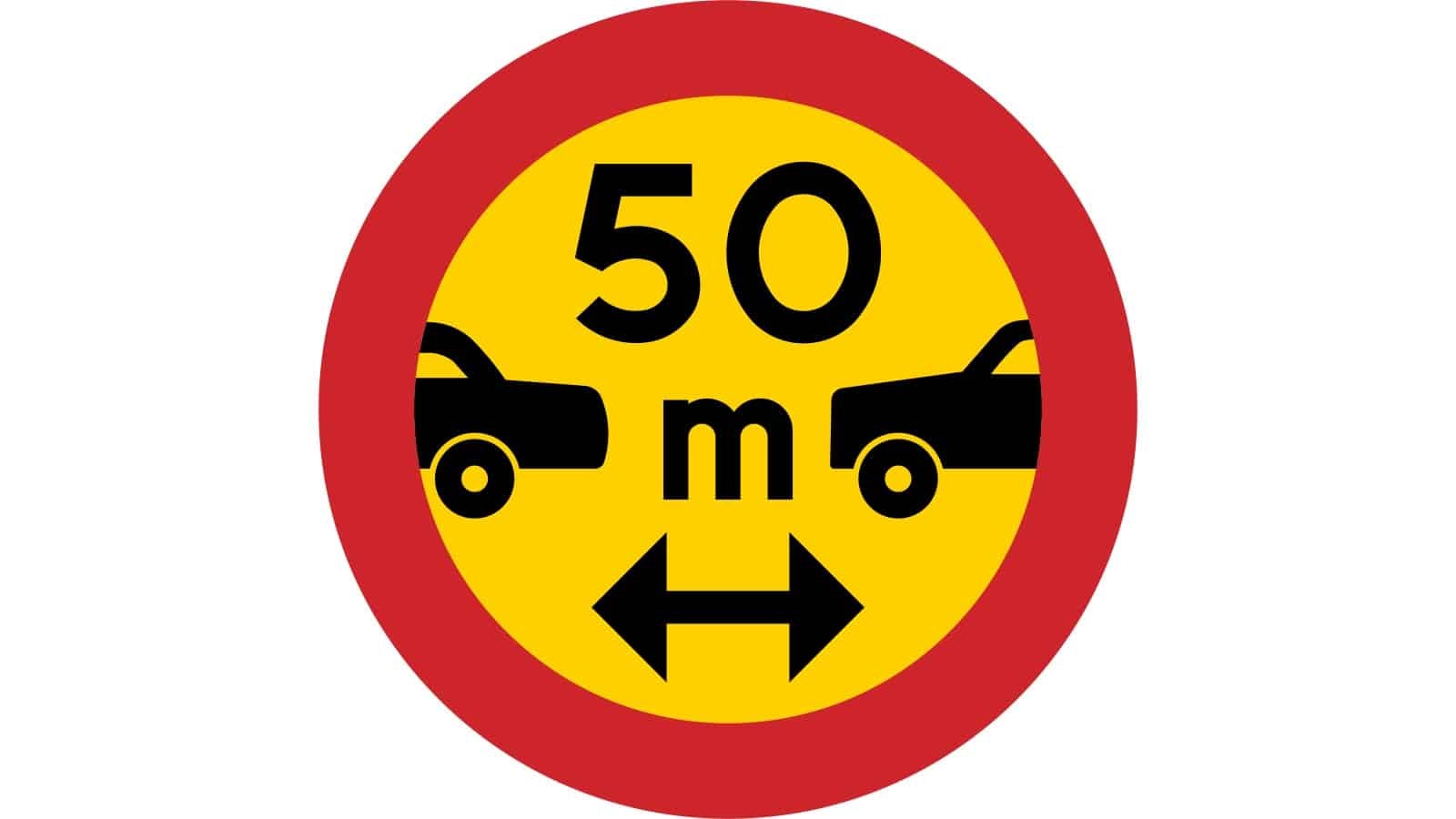 Skylten anger minimiavstånd mellan bilar – i det här fallet måste du hålla ett avstånd på 50 meter till bilen framför. Antalet meter skylten visar kan variera.
