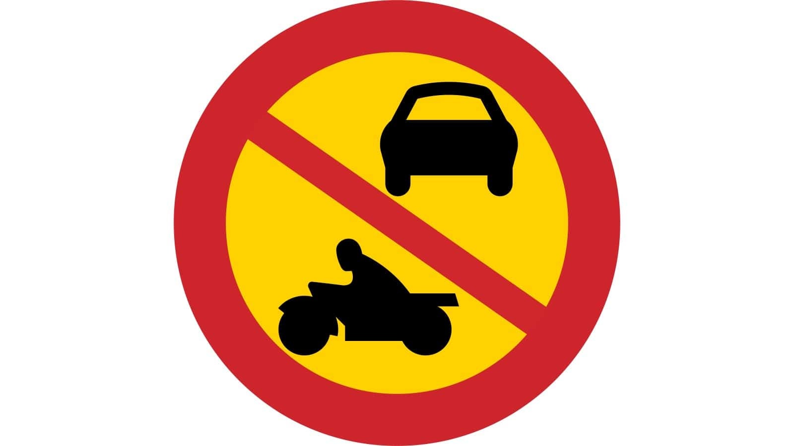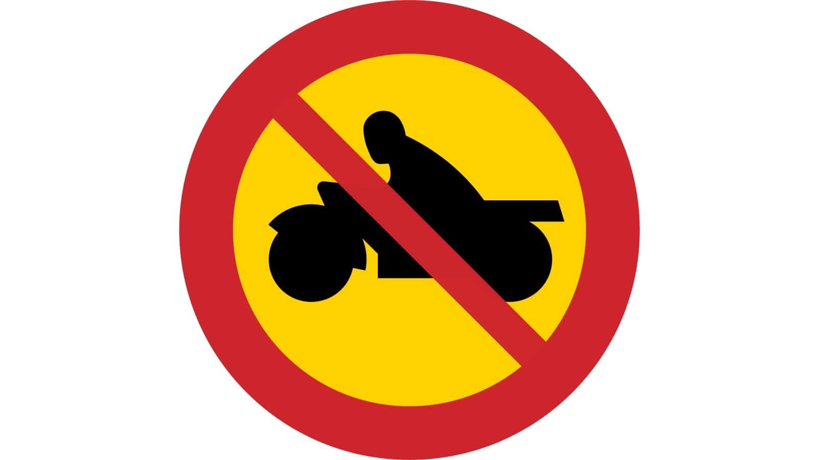 Förbud mot motorcyklar och moped klass I. Motorcyklar samt mopeder klass I får inte färdas på vägen.