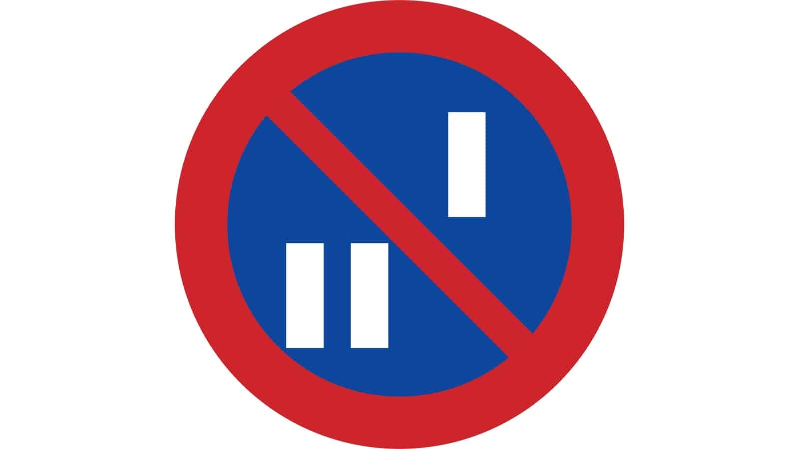 Förbud att parkera fordon på jämna datum. Denna skylt anger att det är förbud mot att parkera ett fordon på en gata med jämna husnummer om det är ett jämnt datum.