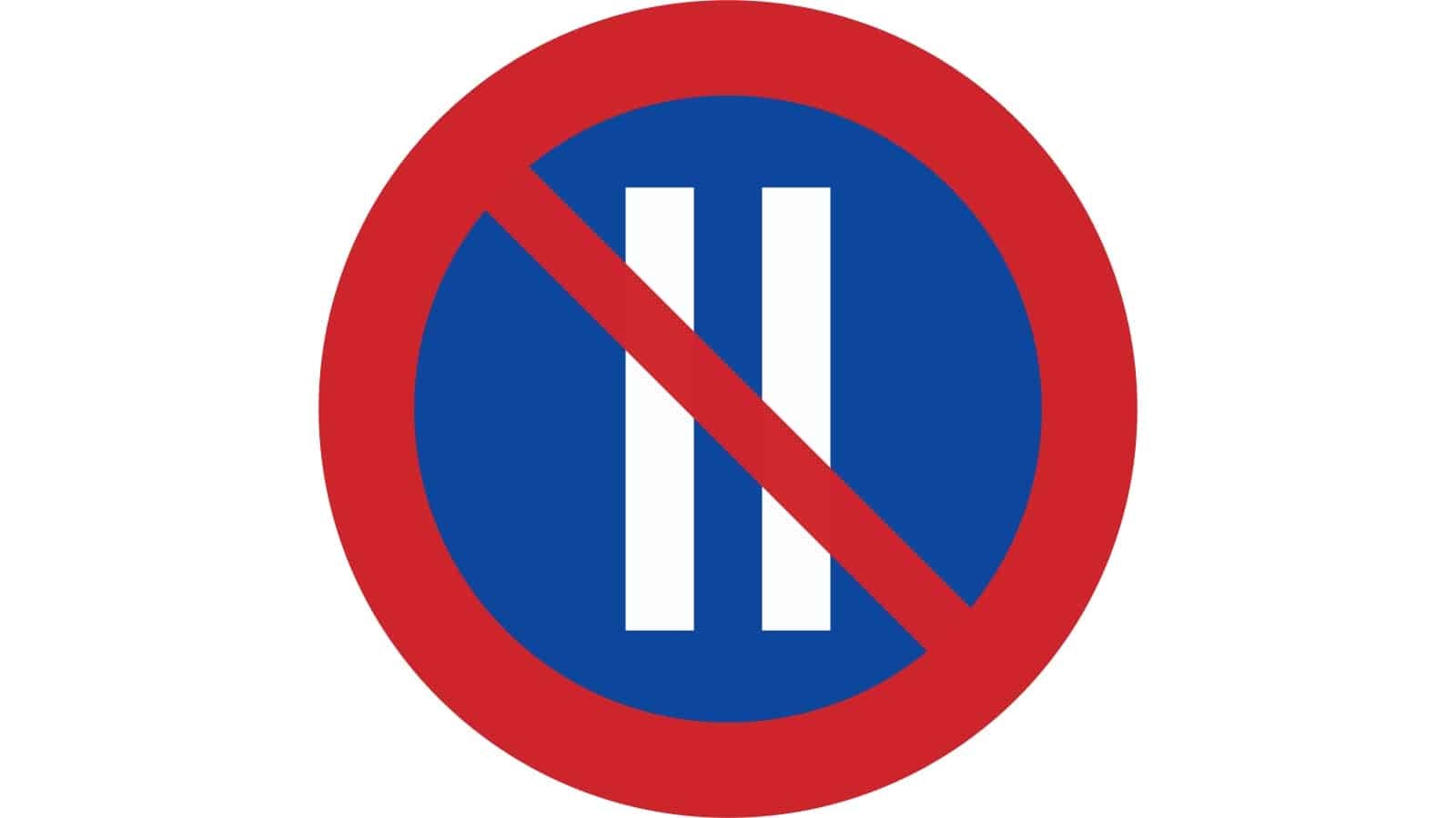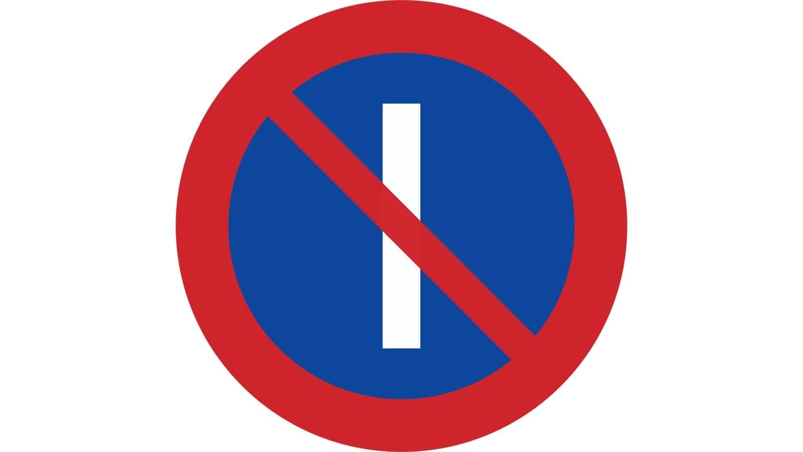 Förbud mot att parkera. Denna skylt förbjuder dig att parkera. Förbudet gäller på den sida av vägen där skylten är placerad. Det är dock inte förbjudet att stanna.