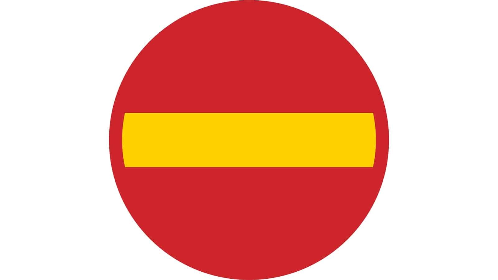 Förbud mot att passera med fordon. Passera ej skylten då den förbjuder fordon att passera. Detta gäller i båda riktningarna av märket.