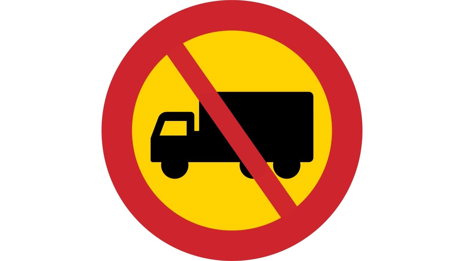 Lastbilar förbjudna. Denna skylt anger ett förbud mot trafik med tung lastbil, dvs. att tungt lastade lastbilar får inte färdas på denna väg. I vissa fall kan en tilläggstavla ange att det även är förbjudet att färdas med lätt lastbil bortom denna skylt.