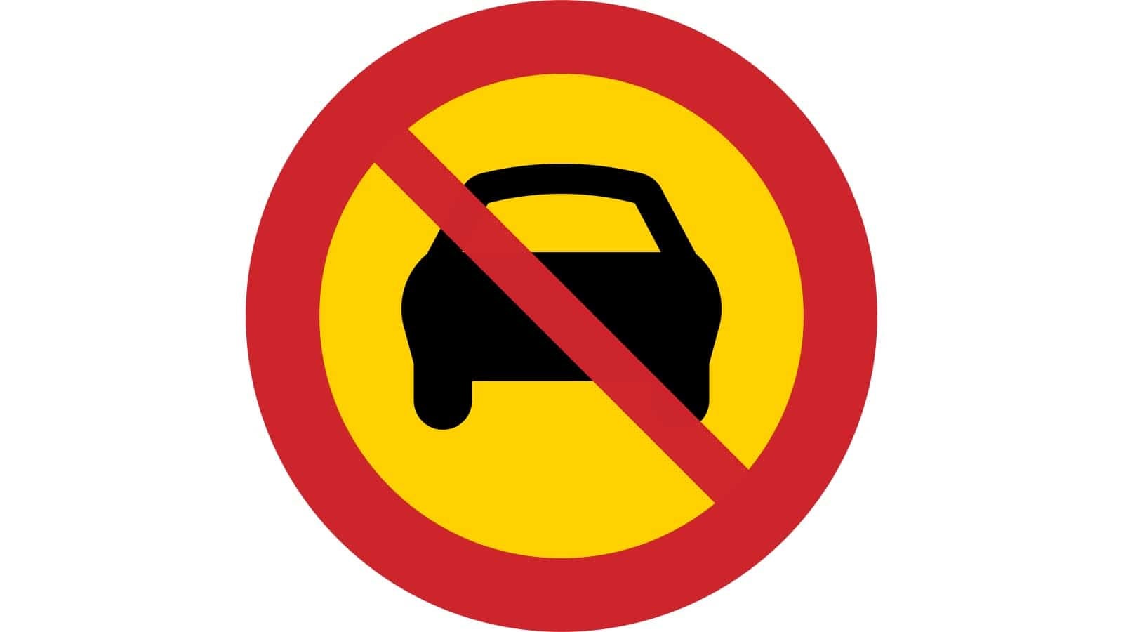 Förbud mot motordrivna fordon. Trafikskylten förbjuder alla motordrivna fordon förutom mopeder klass II.