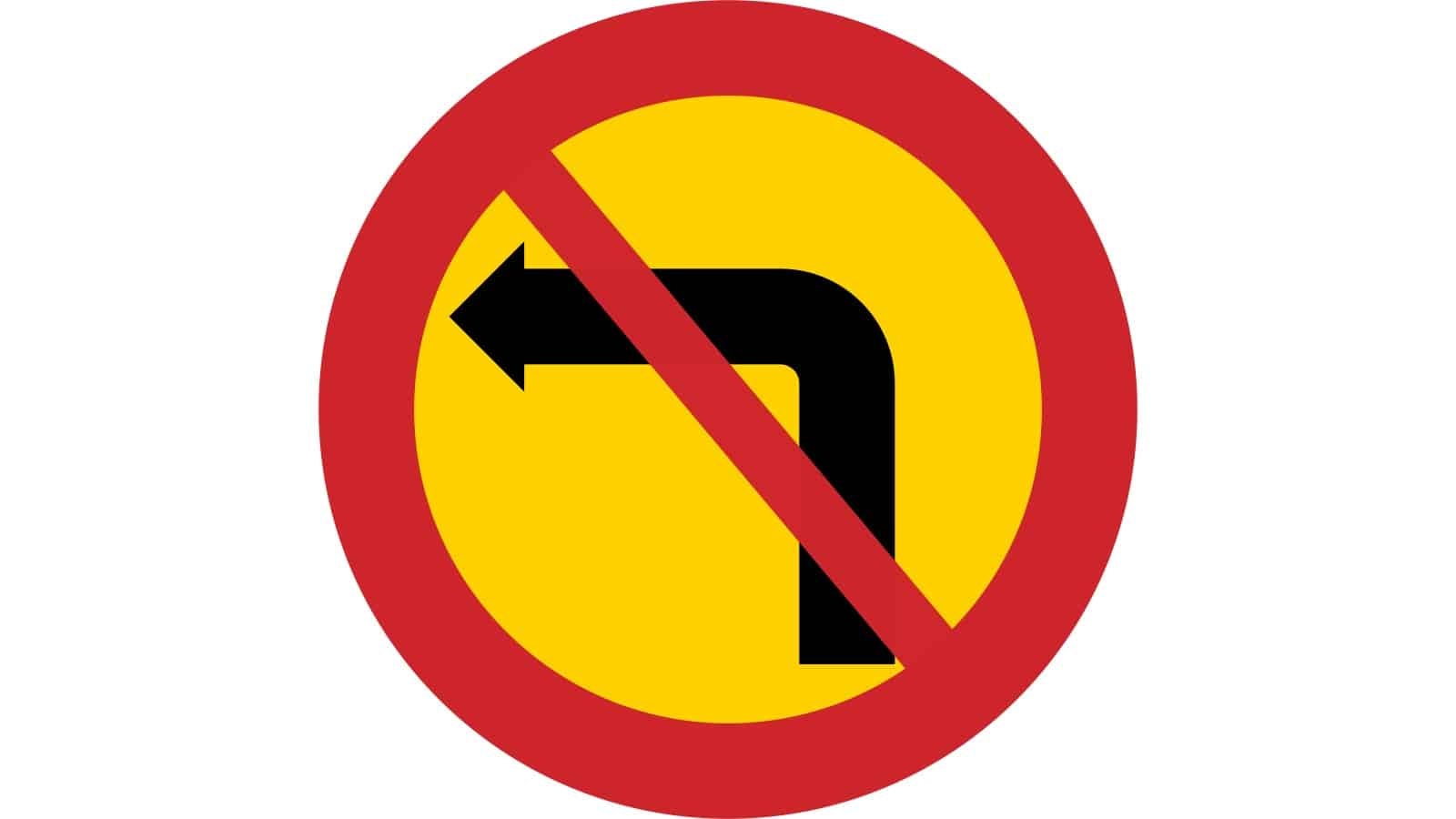 Förbud mot vänstersväng. Skylten anger att du inte får svänga vänster i denna korsning. Skylten kan variera och förbjuda andra typer av svängar beroende på omständigheterna i korsningen.