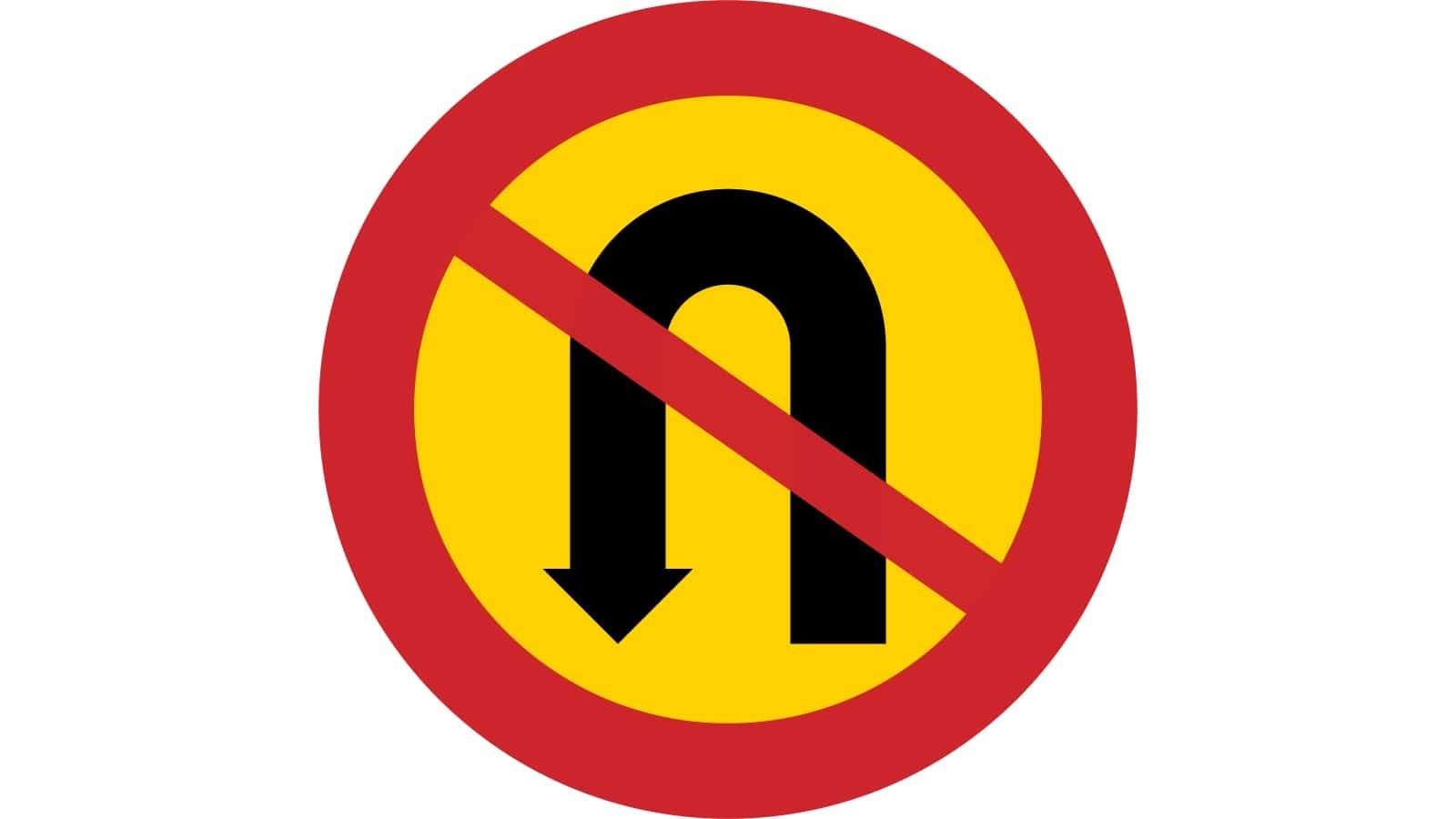 Förbud mot U-sväng. Denna skylt förbjuder dig att göra en U-sväng. Förbudet gäller den korsning där vägmärket är placerat.