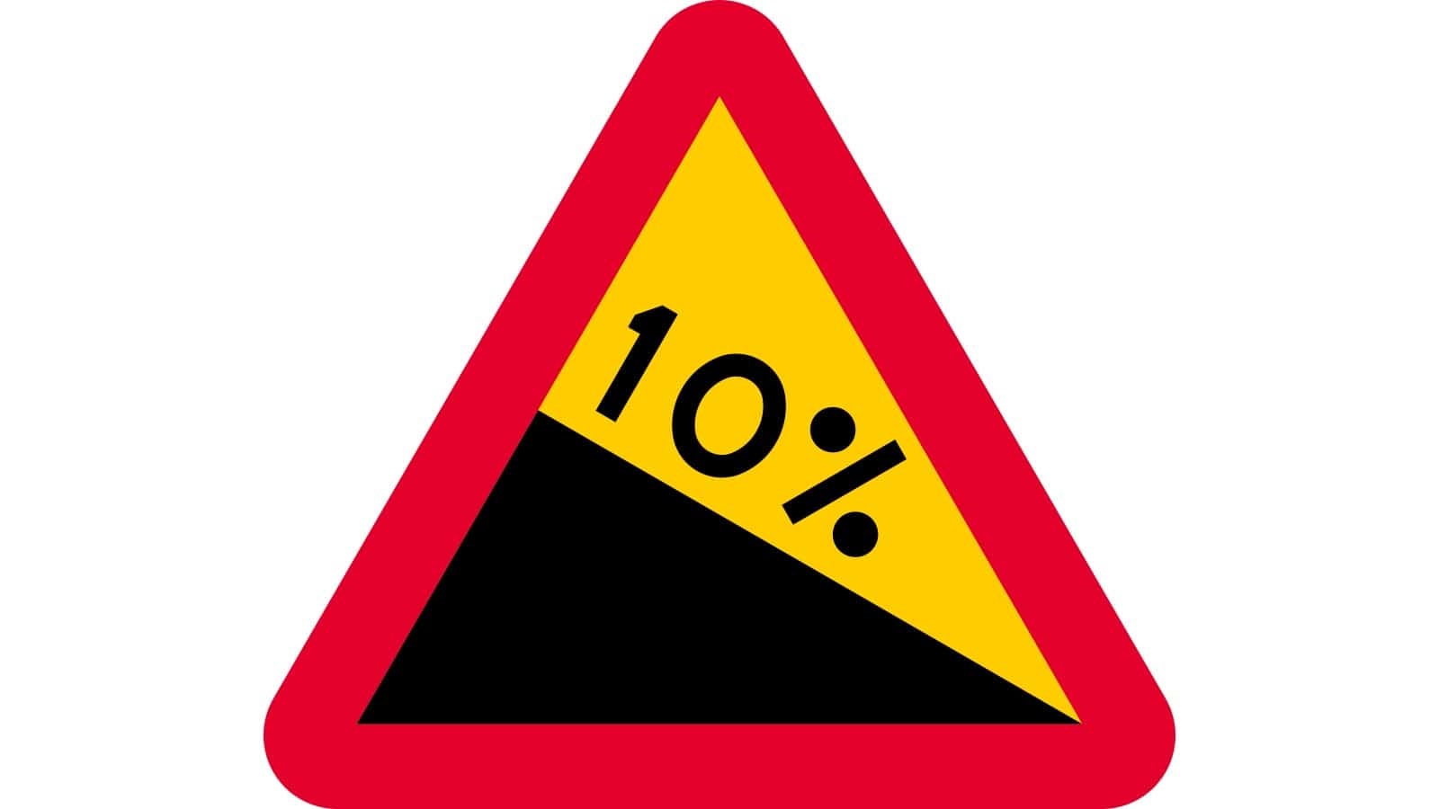 Varning för nedförslutning. Detta vägmärke varnar för en nedförslutning på 10%. Använd en låg växel utan att gasa och använda kopplingen när du kör ner för nedförslutningen för att både spara på bilens bromsar och miljön. Att köra på detta sätt kallas för att motorbromsa. Ju lägre växel, desto mer motorbromsar du.