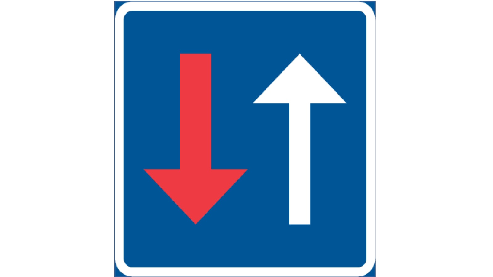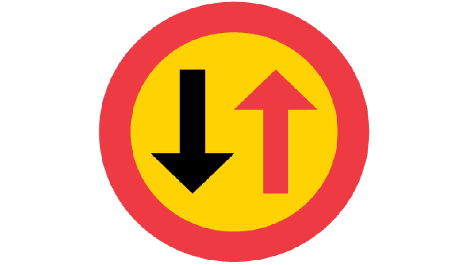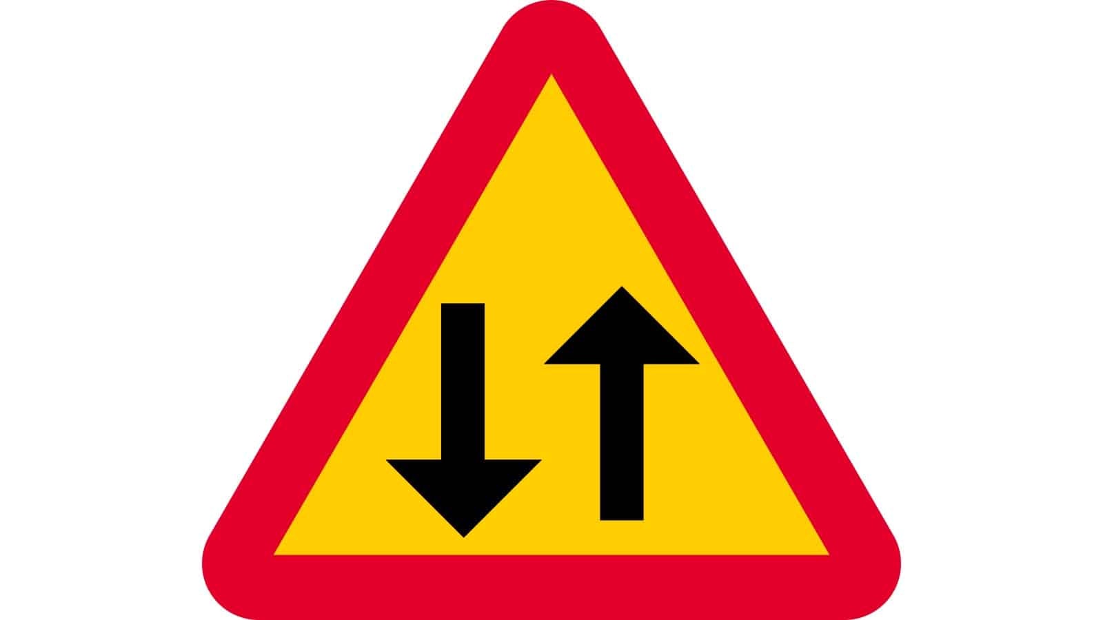 Varning för mötande trafik. Varningsmärket varnar dig för att du framöver kommer att möta trafik då vägen övergår till att ha trafik i båda riktningarna.