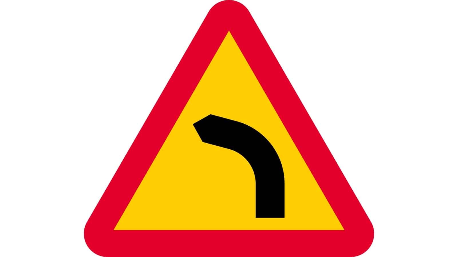 Varning för farlig kurva. Skylten varnar för en farlig kurva åt något håll. I detta fall är kurvan åt vänster och du bör sänka hastigheten i anslutning till skylten.