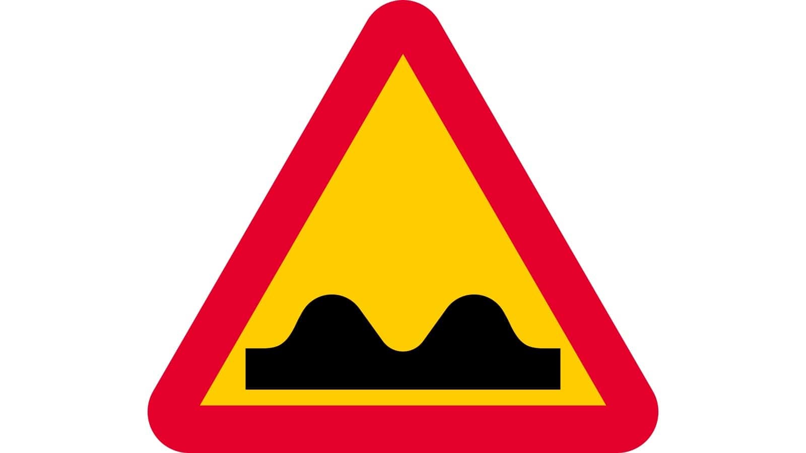 Varning för ojämn väg. Denna skylt kan förekomma om vägen är ojämn eller skadad. Du rekommenderas att sänka hastigheten på vägar som är ojämna eller skadade.