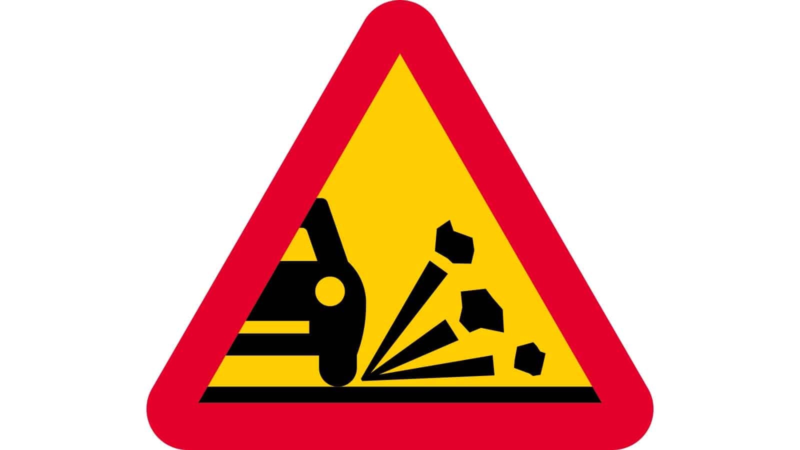 Varning för stenskott. Denna skylt varnar för att stenskott. Du finner den inte på vägar där stenskott är vanligt förekommande, ex grusvägar, utan på vägar där du inte kan förvänta dig stenskott normalt. Sänk hastigheten och kör varsamt när du får möte.