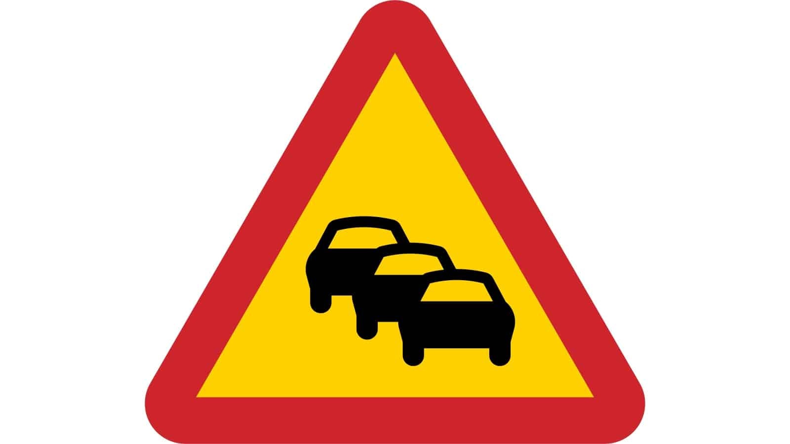 Varning för köbildning. Denna skylt finner du framförallt i närheten av större städer. Den varnar för att köbildning kan förekomma i samband med rusningstrafik.