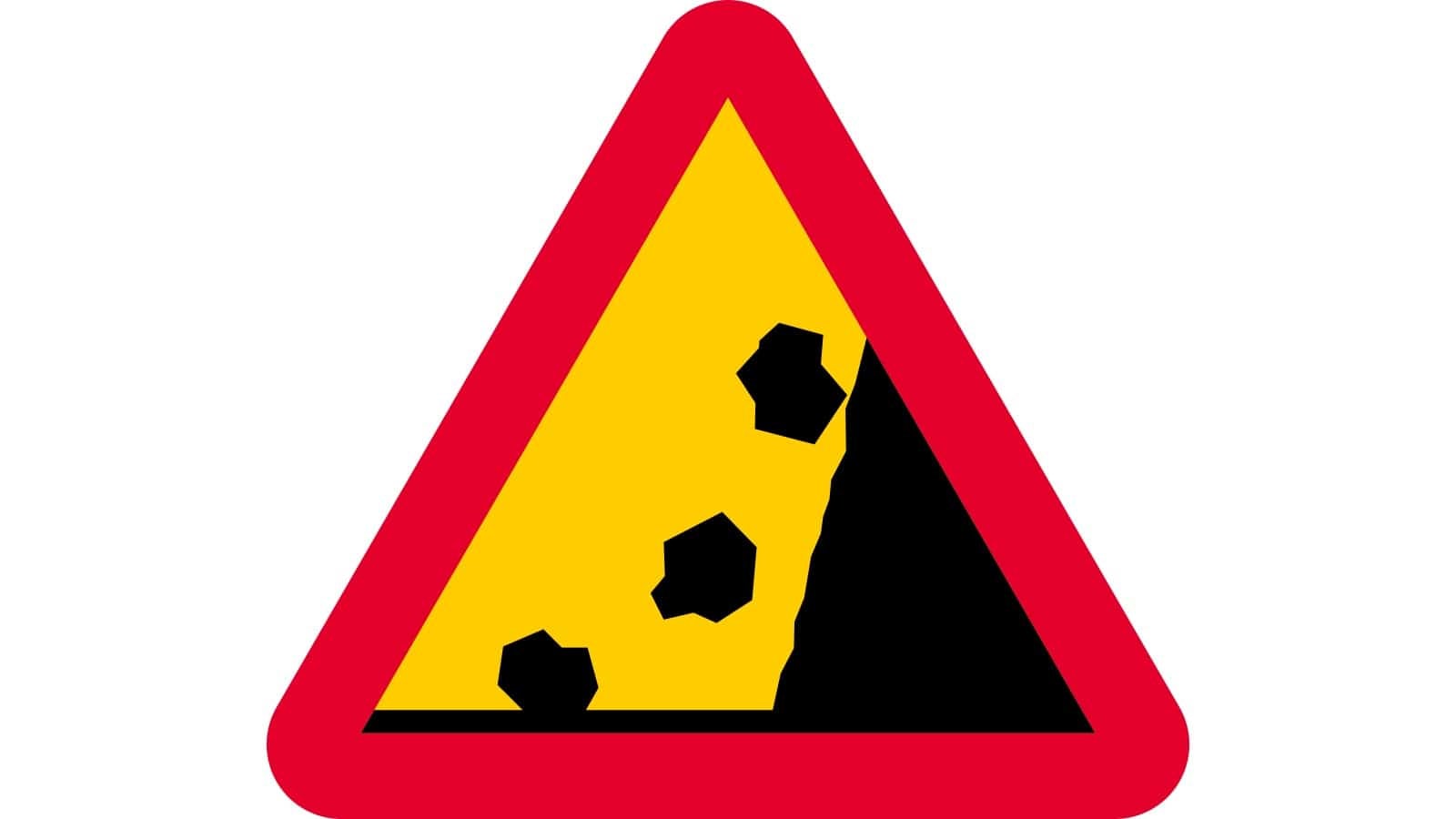 Varning för stenras. Skylten varnar för stenras och att det kan finnas sten på vägen. Kör med försiktighet om du ser denna skylt.