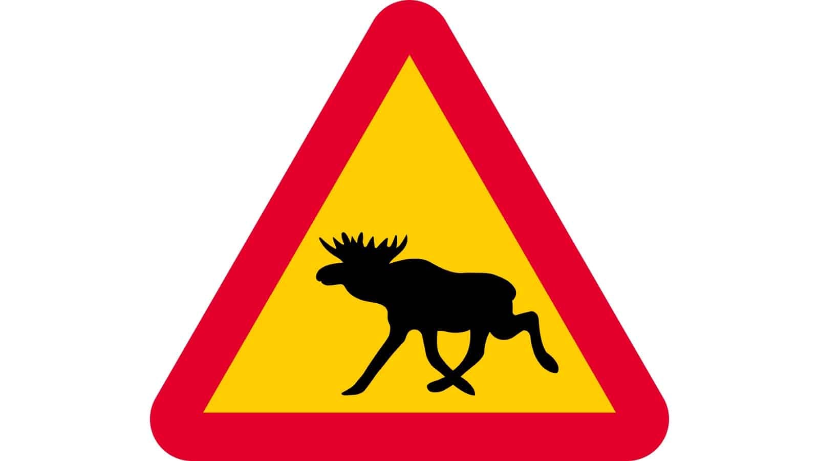 Varning för djur. Varningsmärket varnar för att det kan finnas djur i närheten av vägen. I detta fall varnar skylten för älg men det kan även förekomma andra djur på varningsskylten. Exempel på andra djur är vildsvin, hjort eller häst.
