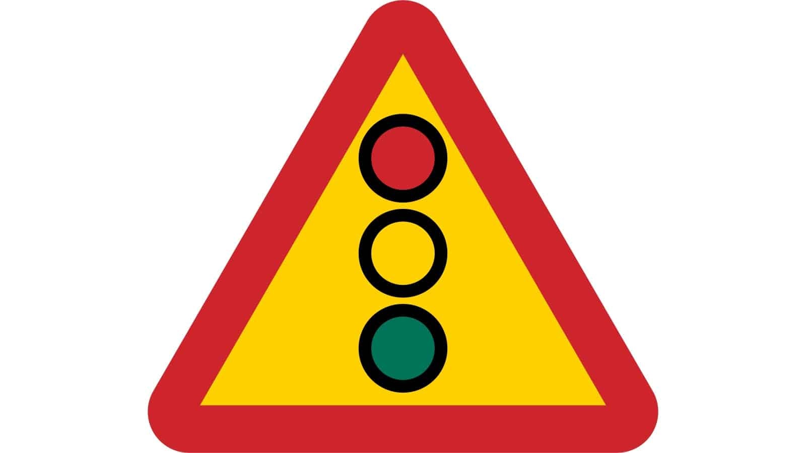 Varning för flerfärgssignal. Trafikskylten varnar för ett trafikljus (flerfärgssignal). Skylten är inte uppsatt framför alla trafikljus utan endast om det finns särskilda skäl för det.