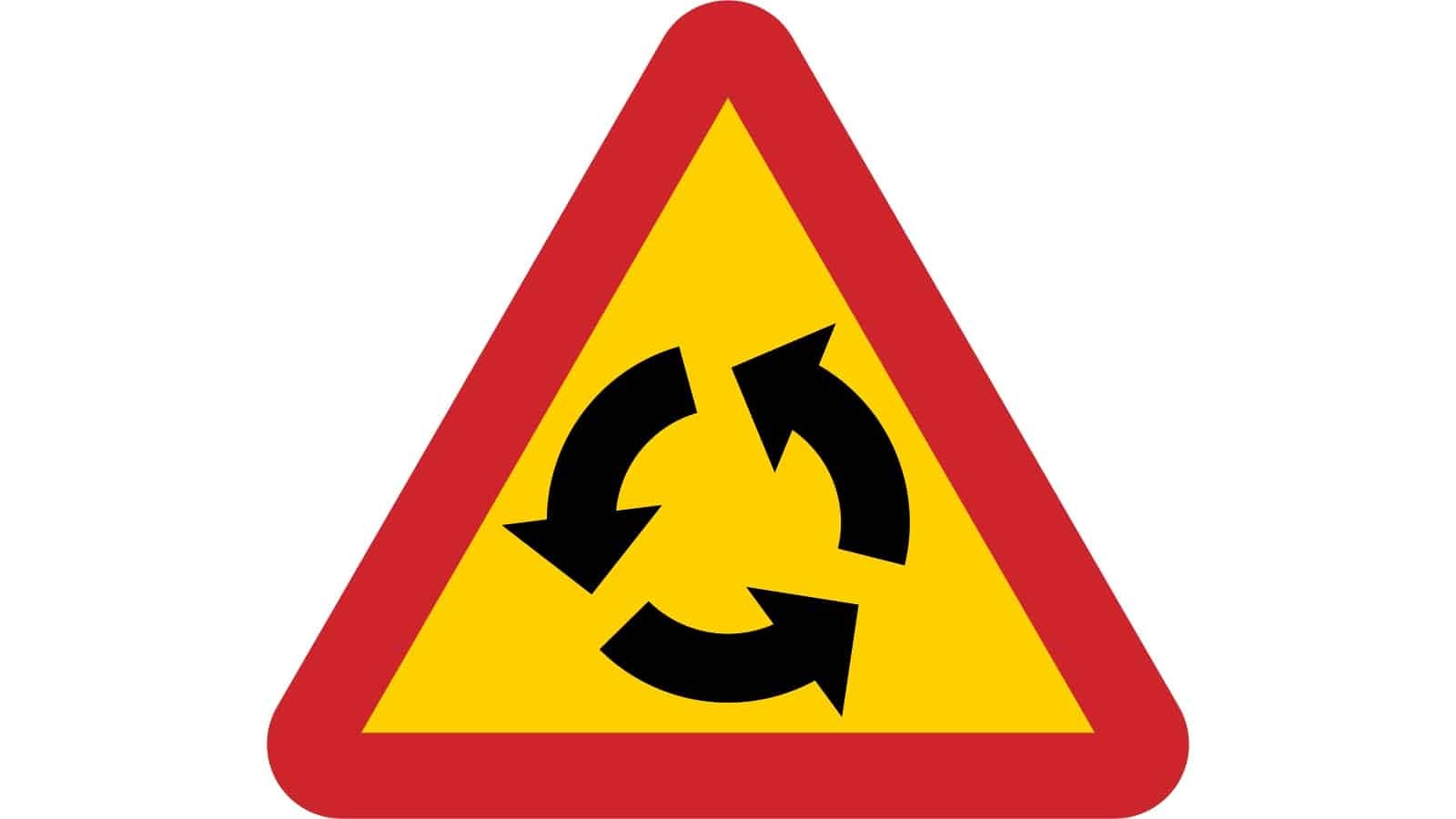 Cirkulationsplats. Detta påbudsmärke visar att du närmar dig en cirkulationsplats (rondell). Kör försiktigt och var beredd att lämna företräde åt bilar som redan kör i cirkulationsplatsen.