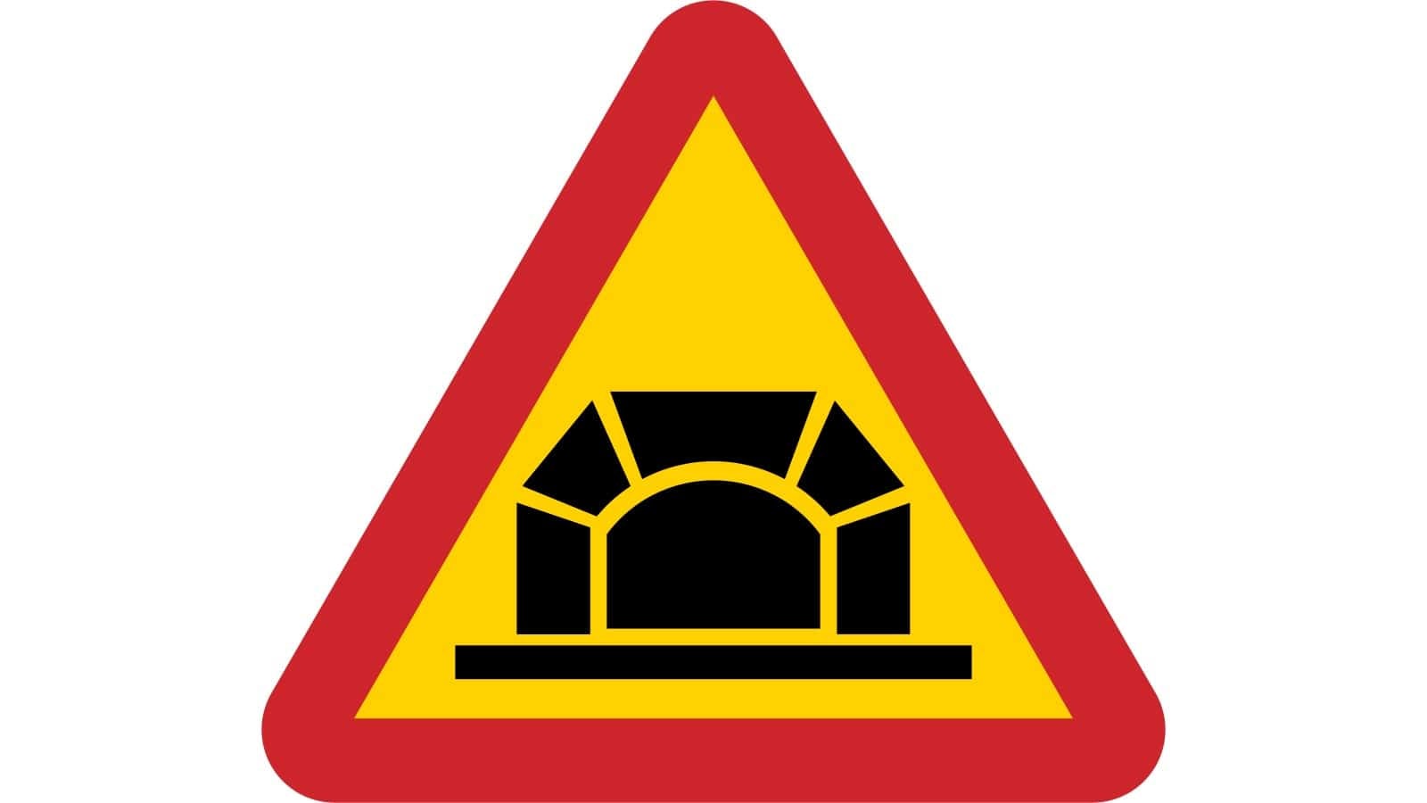 Varning för tunnel. Detta varningsmärke varnar för en tunnel. Tänk på att köra extra försiktigt i en tunnel och helst undvika att byta fil då olyckor i tunnlar kan bli mycket allvarliga.