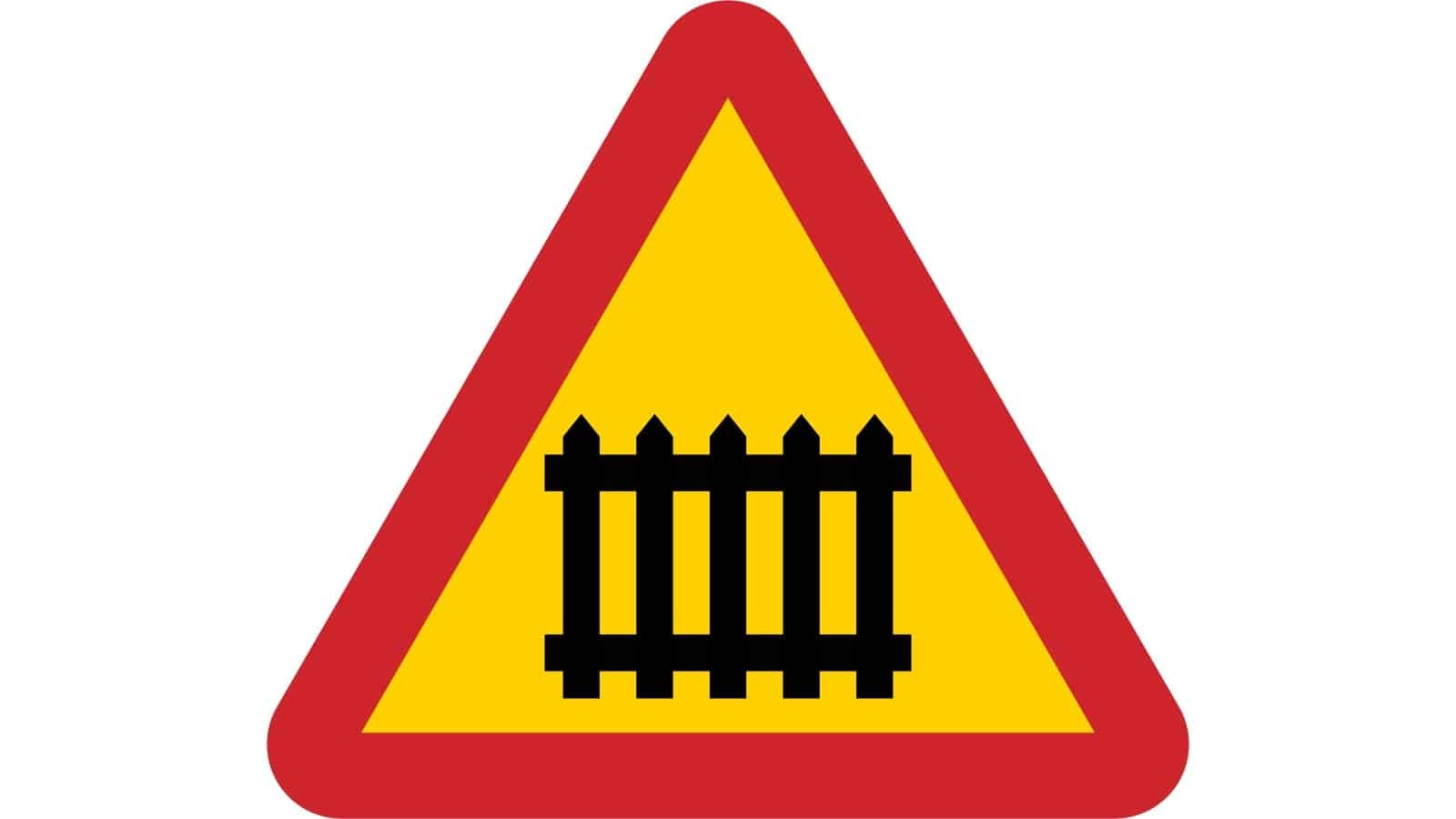 Varning för järnvägskorning med bommar. Varningsmärket varnar för en järnvägskorsning med bommar. Oavsett om det finns bommar eller inte måste du sakta ner och vara väldigt försiktig när du närmar dig järnvägen. Varningssignaler och bommar kan vara ur funktion, och därför bör man inte lita blint på dem. Titta vänster och höger flera gånger innan du kör över spåret för att säkerställa att det inte kommer ett tåg.
