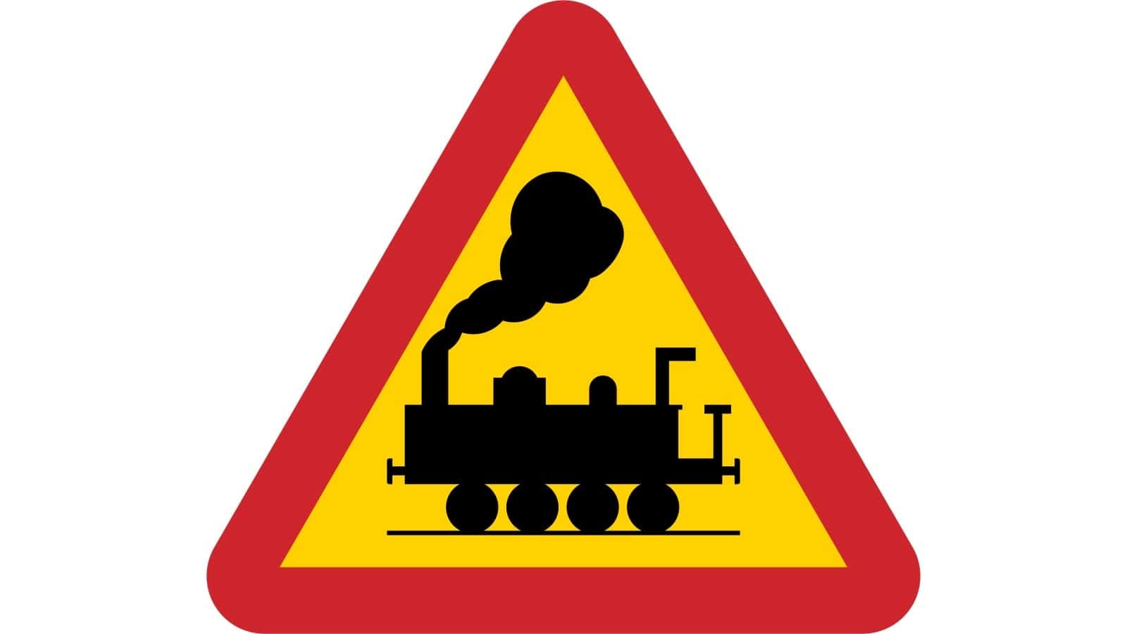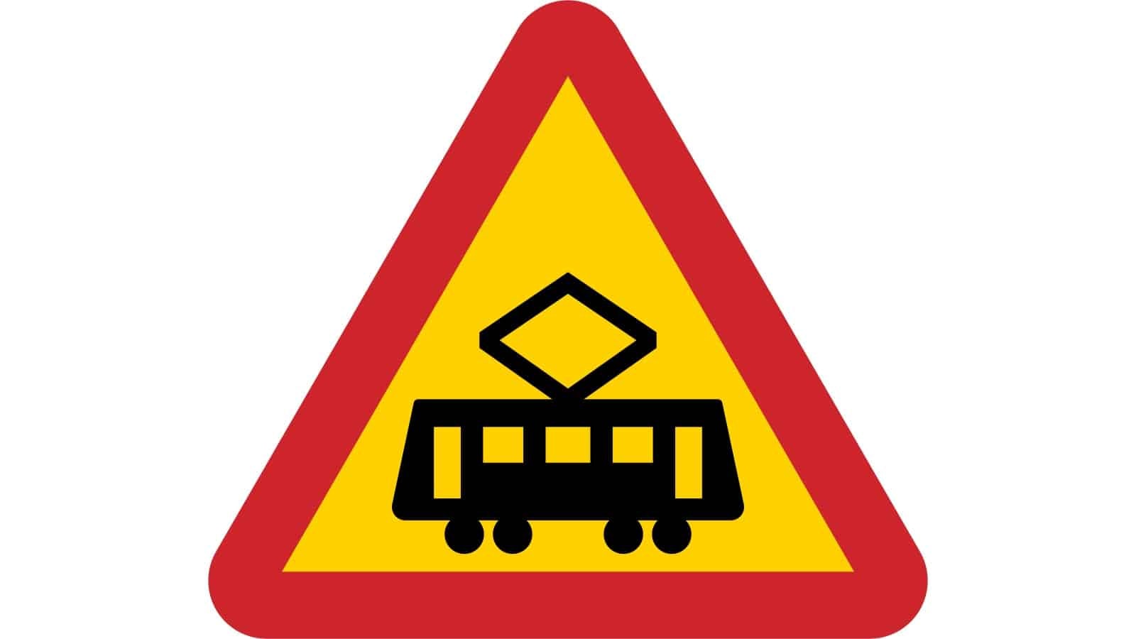 Varning för spårväg utan bommar. Detta varningsmärke varnar för en korsning med spårväg utan bommar. Sakta ner och var väldigt försiktig när du närmar dig spåret. Titta vänster och höger flera gånger innan du kör över spåret.