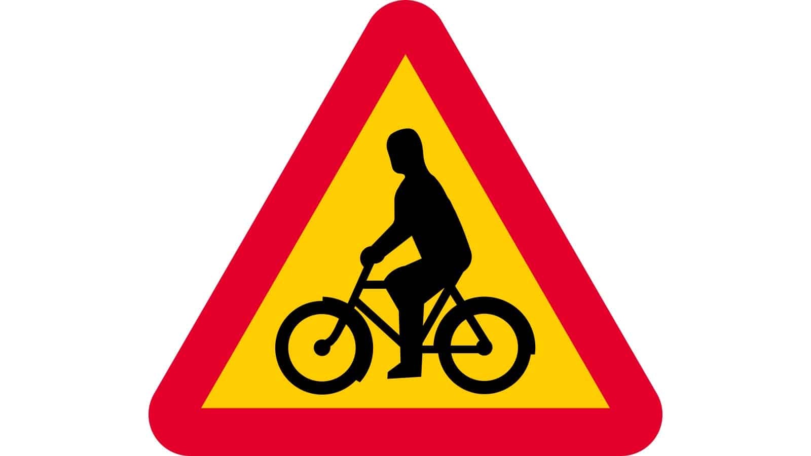 Varning för cyklister. Sakta ner och förbered dig för att lämna företräde eller stanna för cyklister vid behov.