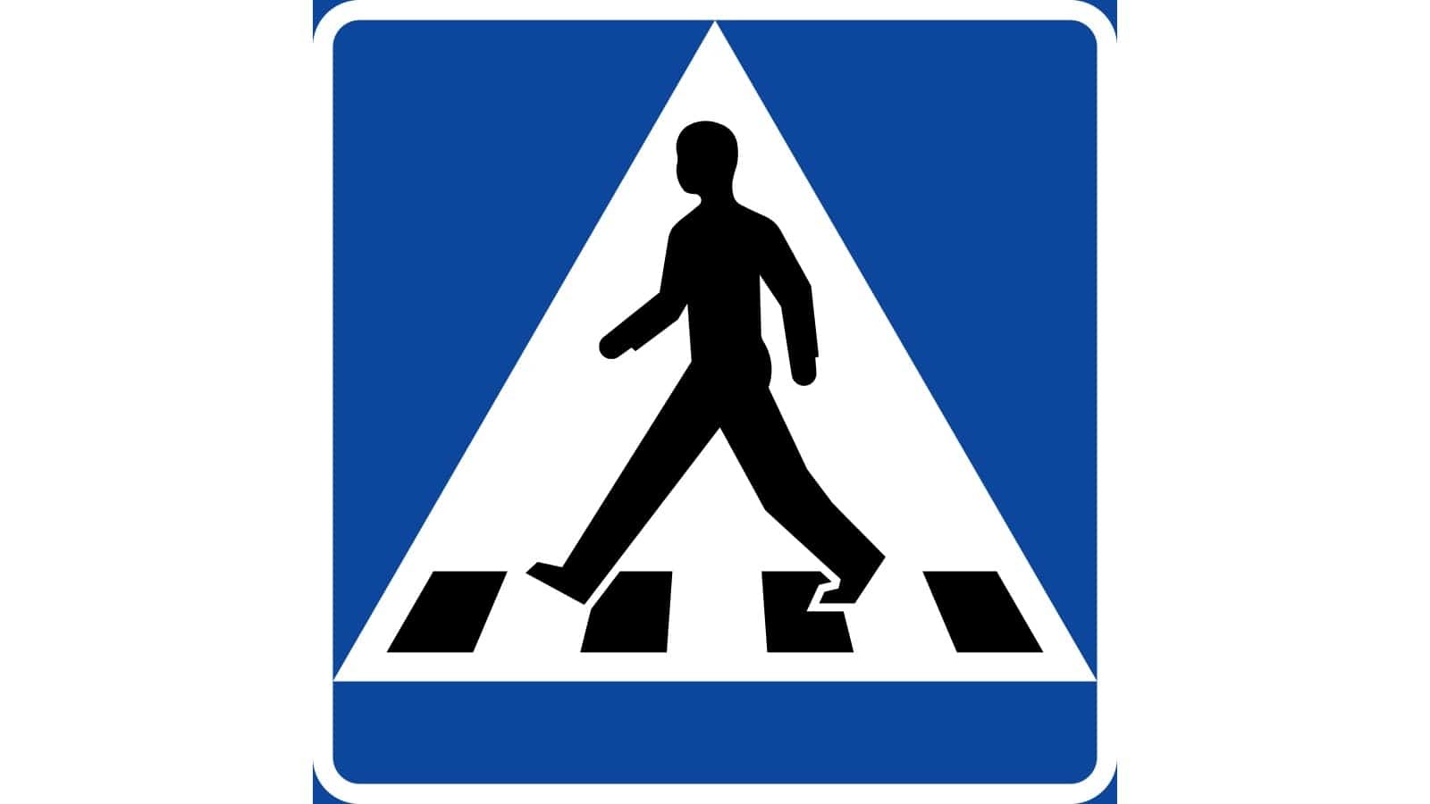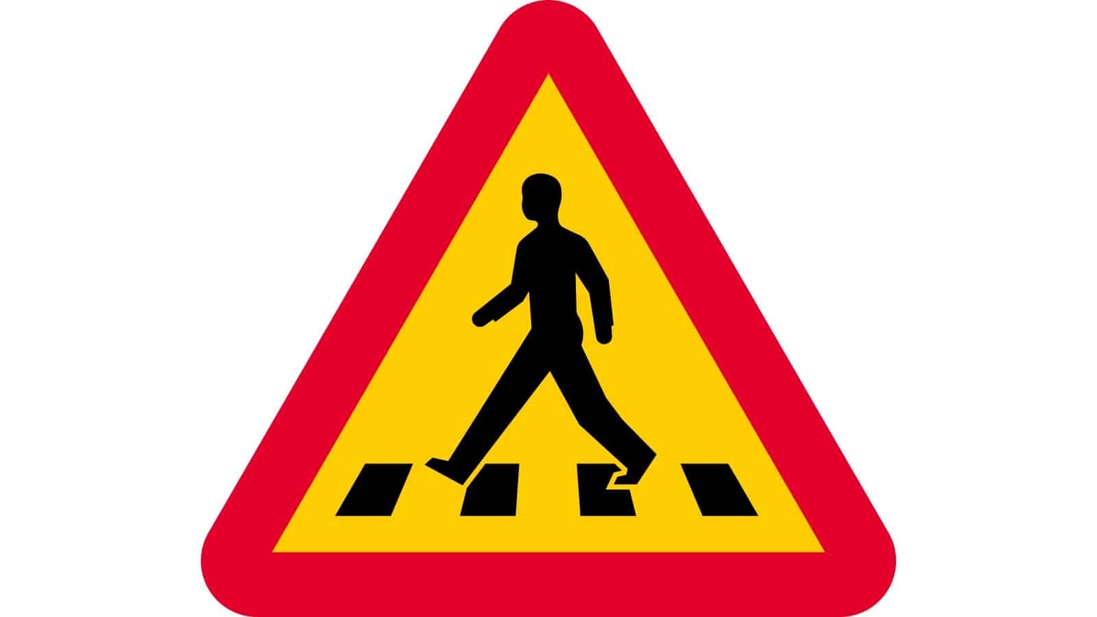 Varning för övergångsställe. Sakta ner hastigheten och förbered dig för att lämna företräde åt fotgängare vid behov. De har alltid företräde vid övergångsställen