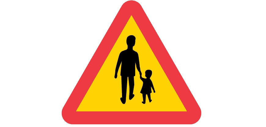 Varning för fotgängare. Denna trafikskylt varnar för att fotgängare kan korsa eller befinna sig i området. Var särskilt försikig om du ser barn i närheten av vägen.