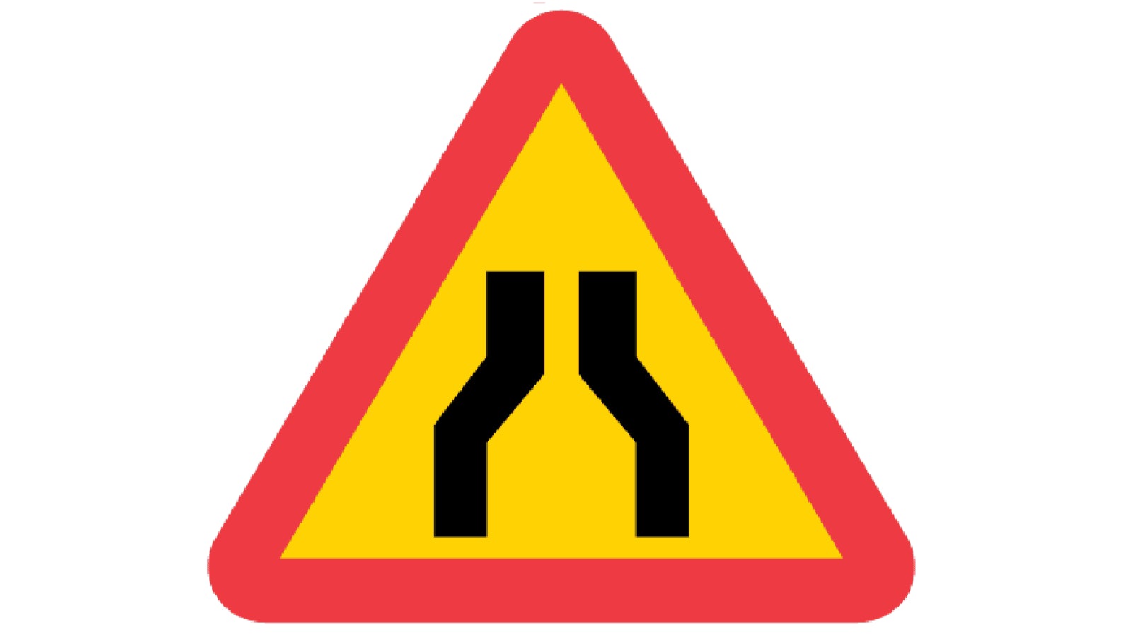 Varning för avsmalnande väg. Varningsmärket anger att vägbanan smalnar av. Kör varsamt när du ser denna skylt.