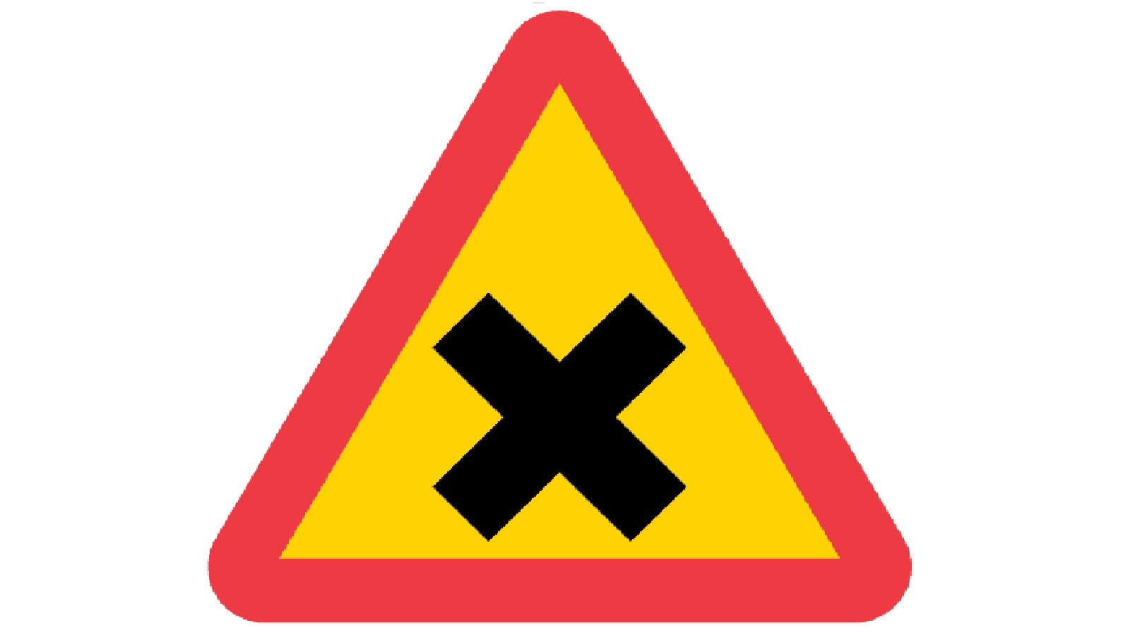 Varning för vägkorsning. Varningsskylten varnar för en vägkorsning där högerregeln gäller. Högerregeln gäller så länge det inte finns några andra tilläggsskyltar som anger annorlunda. Sakta ner och var beredd att lämna företräde åt bilar till höger när du ser denna trafikskylt.