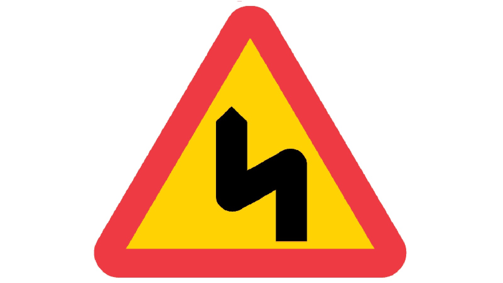 Varning för flera farliga kurvor. Varningsmärket varnar för att det kommer flera farliga kurvor framöver. Vägmärket anger även den första farliga kurvans riktning, i detta fall till vänster.