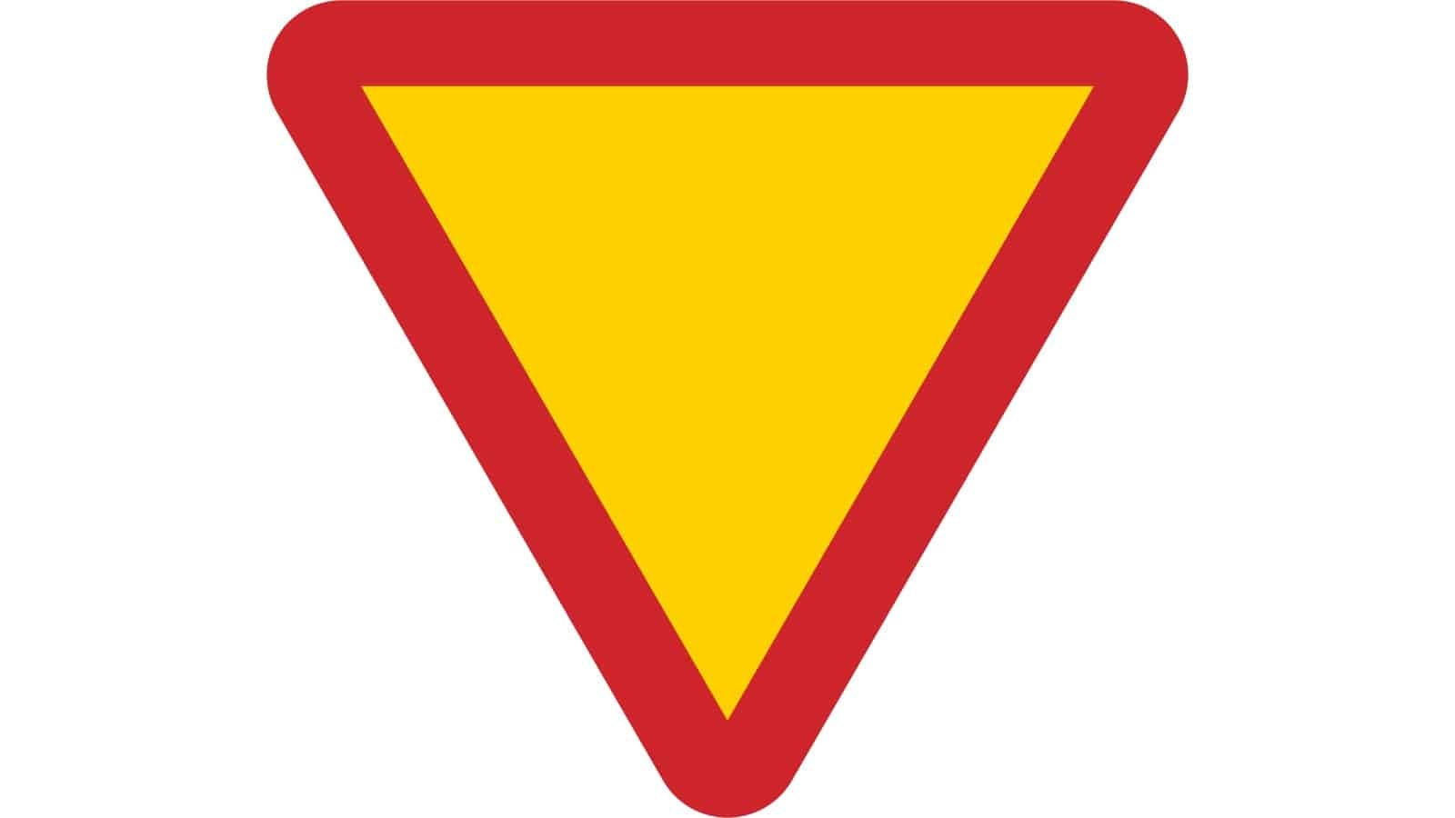 Väjningsplikt. Skylten innebär att du måste lämna företräde åt korsande trafik. Om du ser denna skylt, sänk hastigheten och gör dig redo att väja för andra bilar vid behov. Du måste inte stanna vid skylten om det inte finns någon korsande trafik.