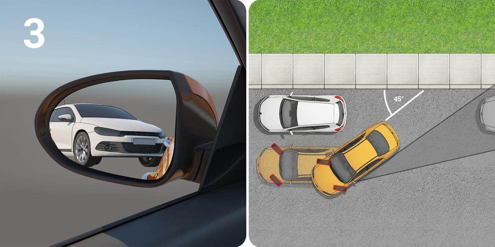Nästa steg är att vrida ratten hela vägen åt höger och långsamt börja backa. Stanna din bil när du kan se bilen bakom dig i din vänstra sidospegel. Du bör se hela framsidan av bilen (se bild 3).