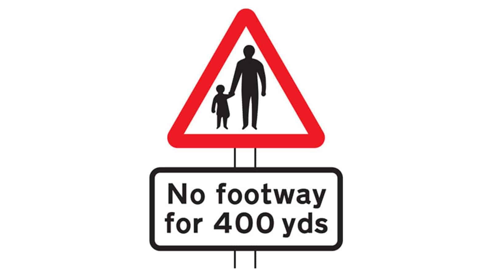 Plate indicates there is no footway for pedestrians to use for 400 yds.