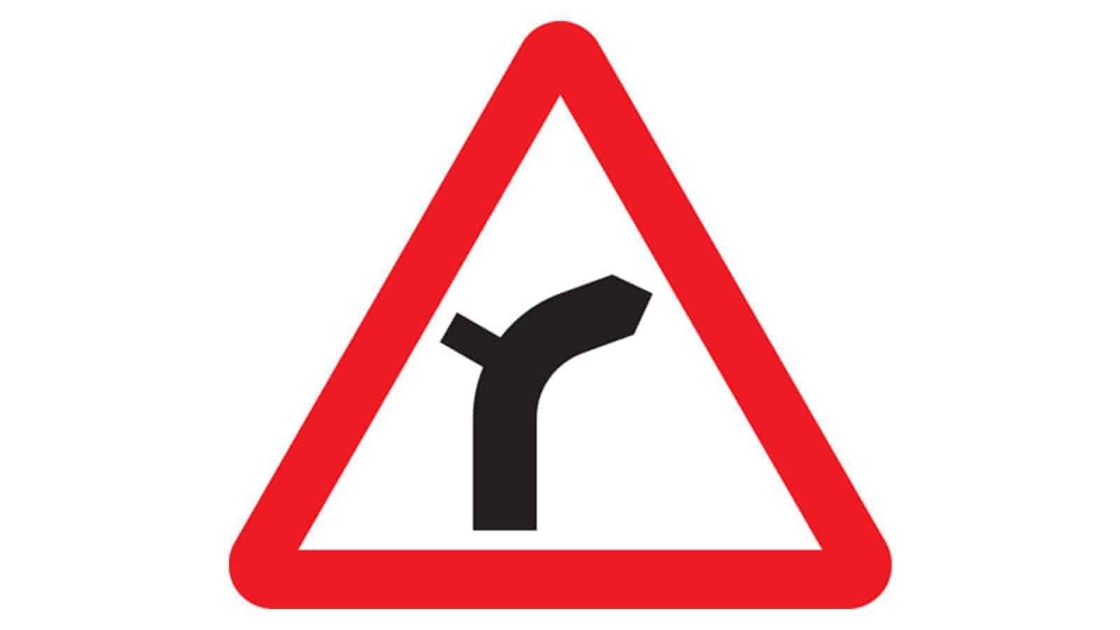 Traffic merges onto the main carriageway. The broader line shows the priority through line.