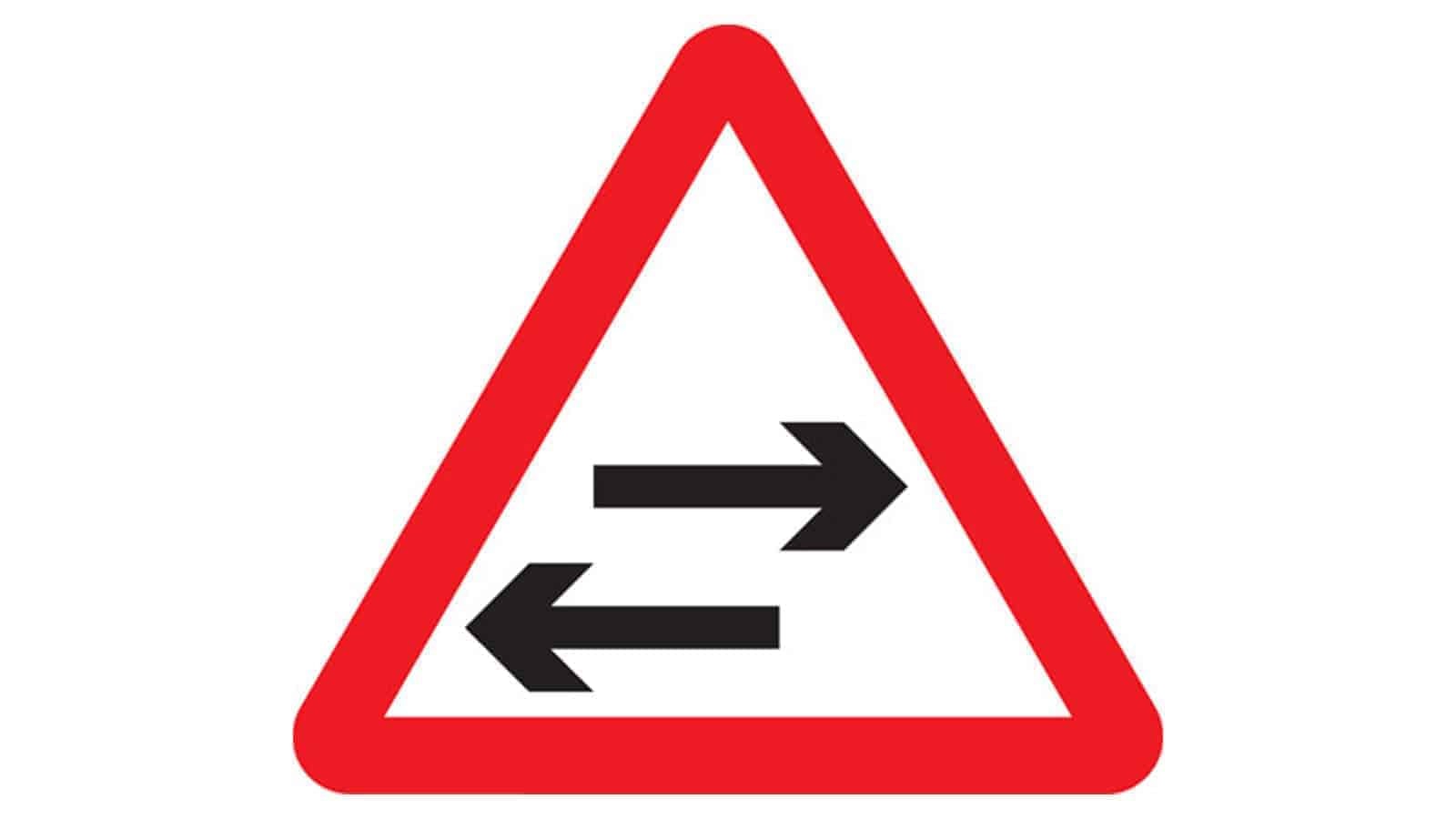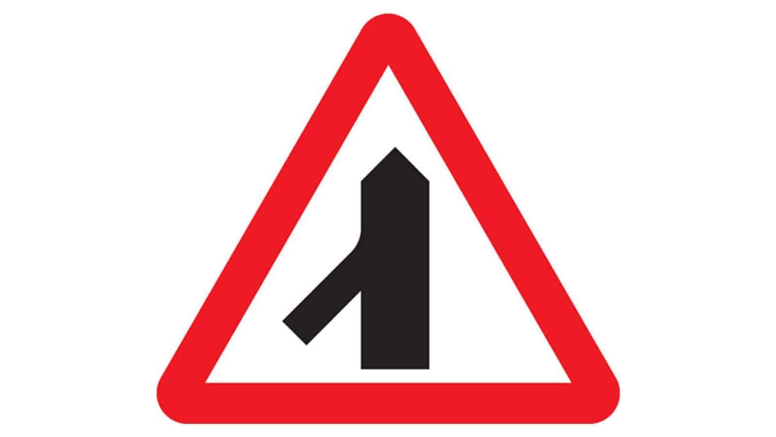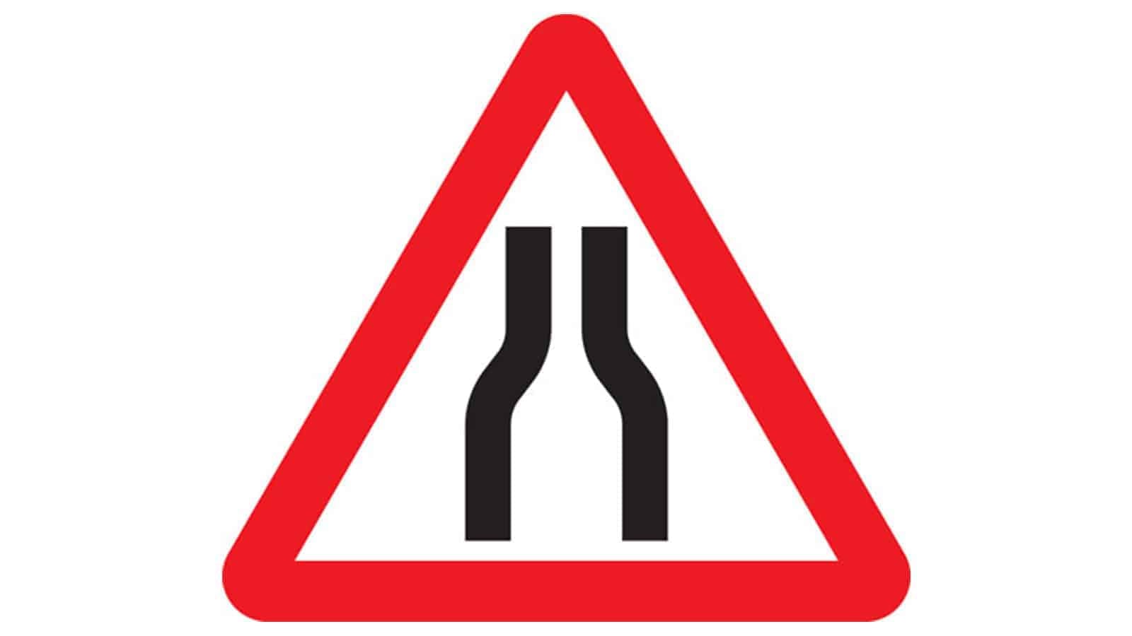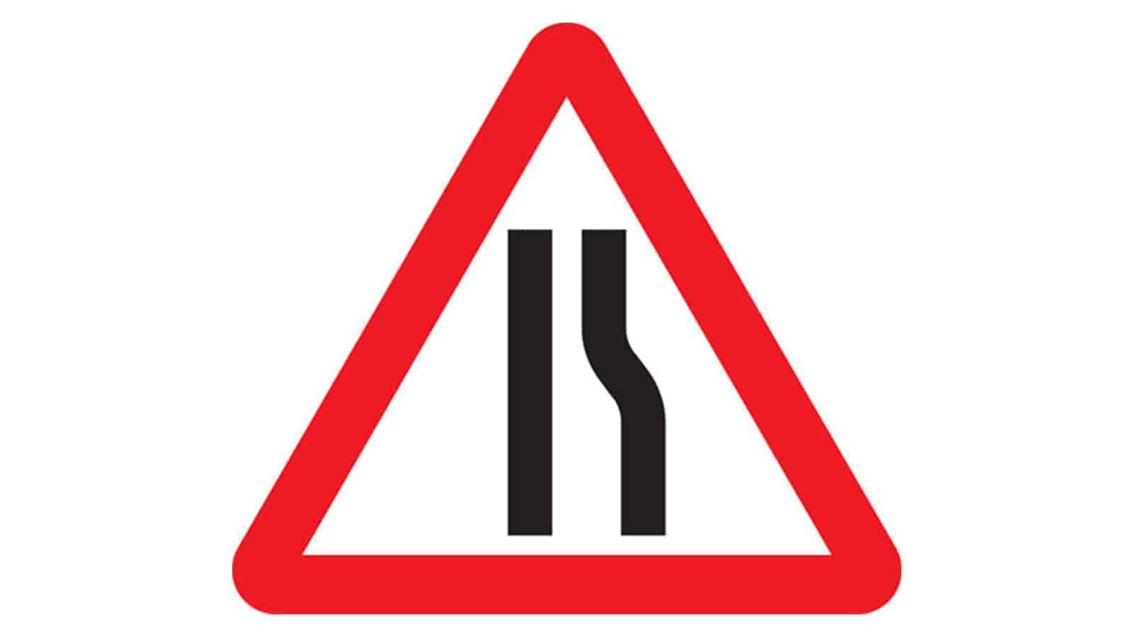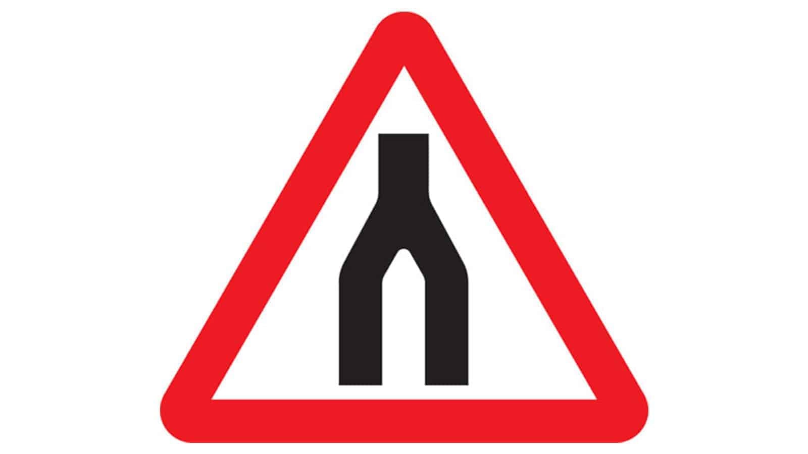 The road narrows symbol can be reversed. When you see this sign, prepare for other vehicles to merge.