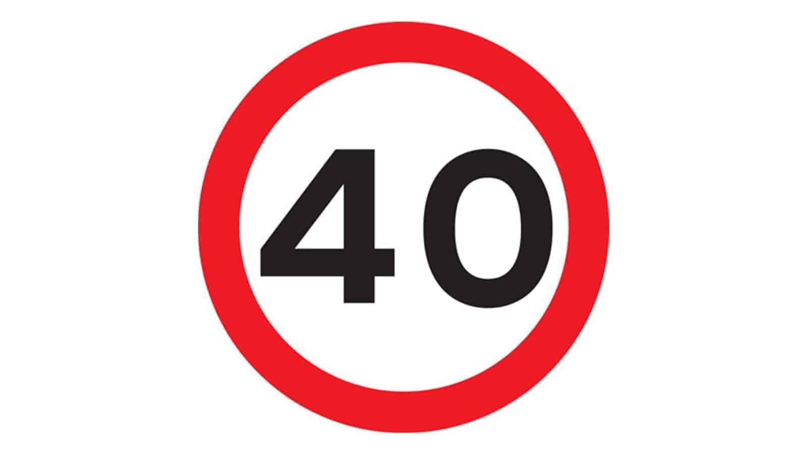 Maximum Speed Limit Sign. Indicates a maximum speed limit of 40 mph. This is the maximum speed at which you may travel under ideal conditions.