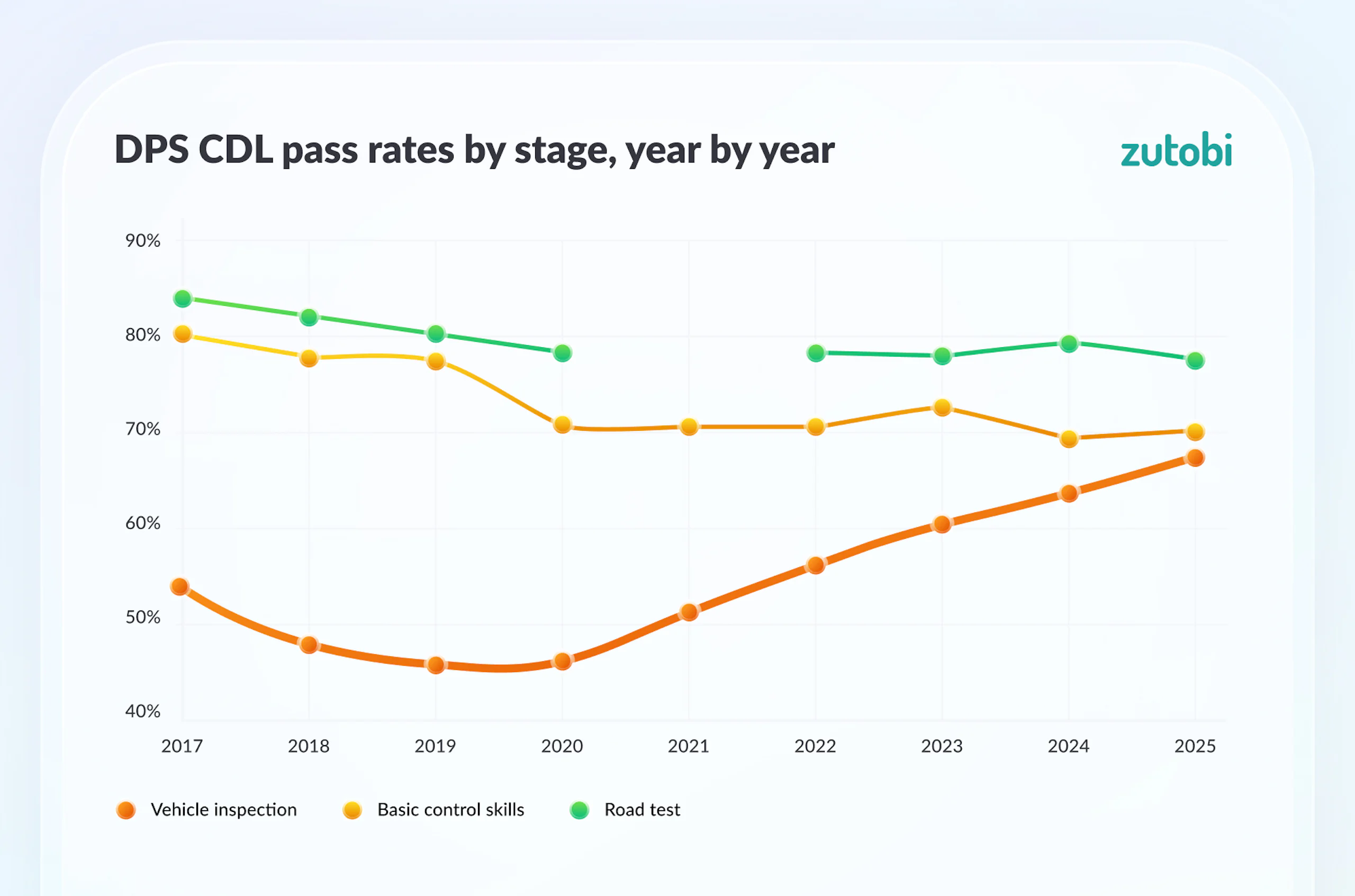 Zutobi, an FMCSA-approved CDL theory provider, analyzed 102 months of Texas Department of Public Safety Driver License Division data, covering more than 850,000 CDL skills test attempts. The goal was to understand where candidates struggle most, how pass rates have changed over time, and what has shifted structurally in one of the country’s biggest CDL testing markets.