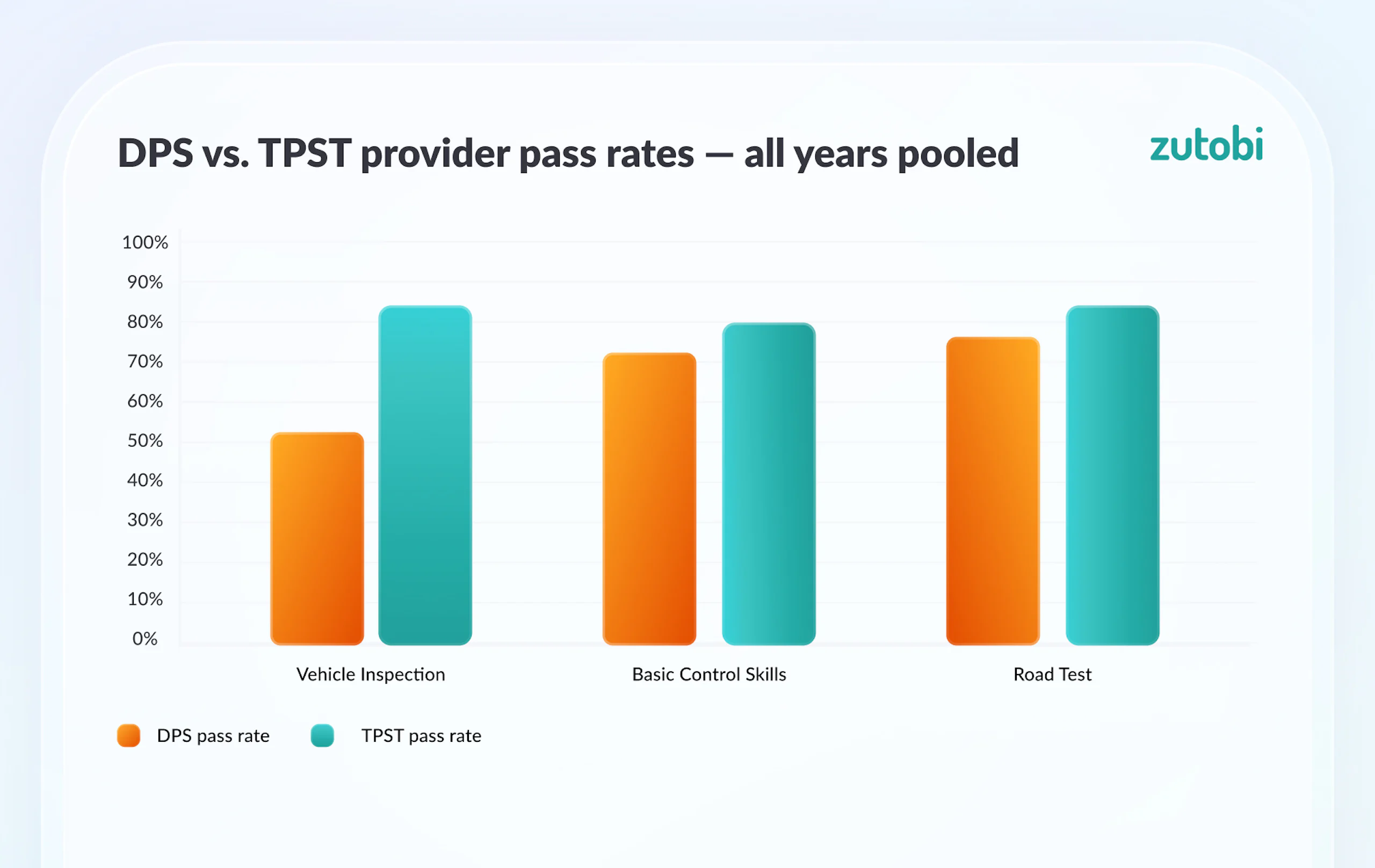 The vehicle inspection gap is the most striking. It is large enough that it almost certainly reflects more than examiner strictness differences alone. Candidate self-selection likely plays a role: drivers who choose to test at a private provider may be more prepared, or may have received hands-on training at that facility. Some TPST providers operate training programs alongside their testing function, which creates a pipeline of better-prepared candidates.