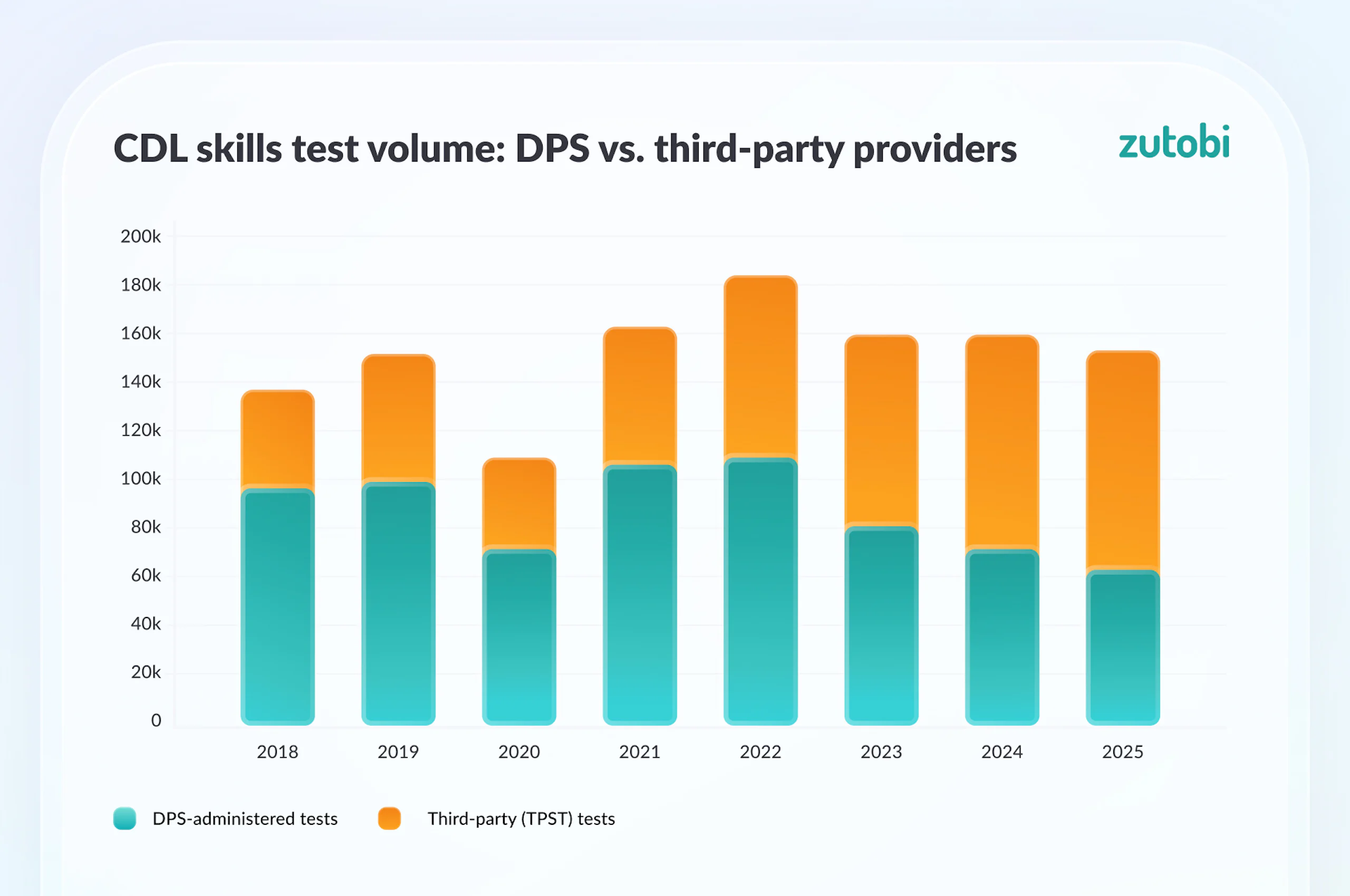 In late 2017, third-party providers handled only about 21% of all CDL skills tests. By 2019, that had grown to 35%. By 2023, third-party providers had caught up with DPS, and by 2025 they handled 59% of all tests.