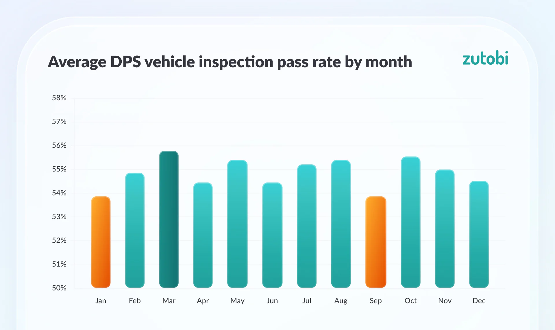 The average DPS vehicle inspection pass rate stays in a very narrow band across the year, roughly between 53% and 56%.