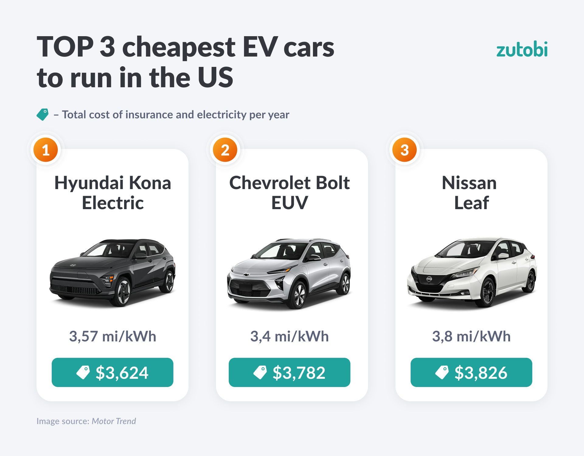 | 1 | Hyundai | Kona Electric (3,57 mi/kWh) | $0.13 | $1,764 | $1,860 | $3,624 |