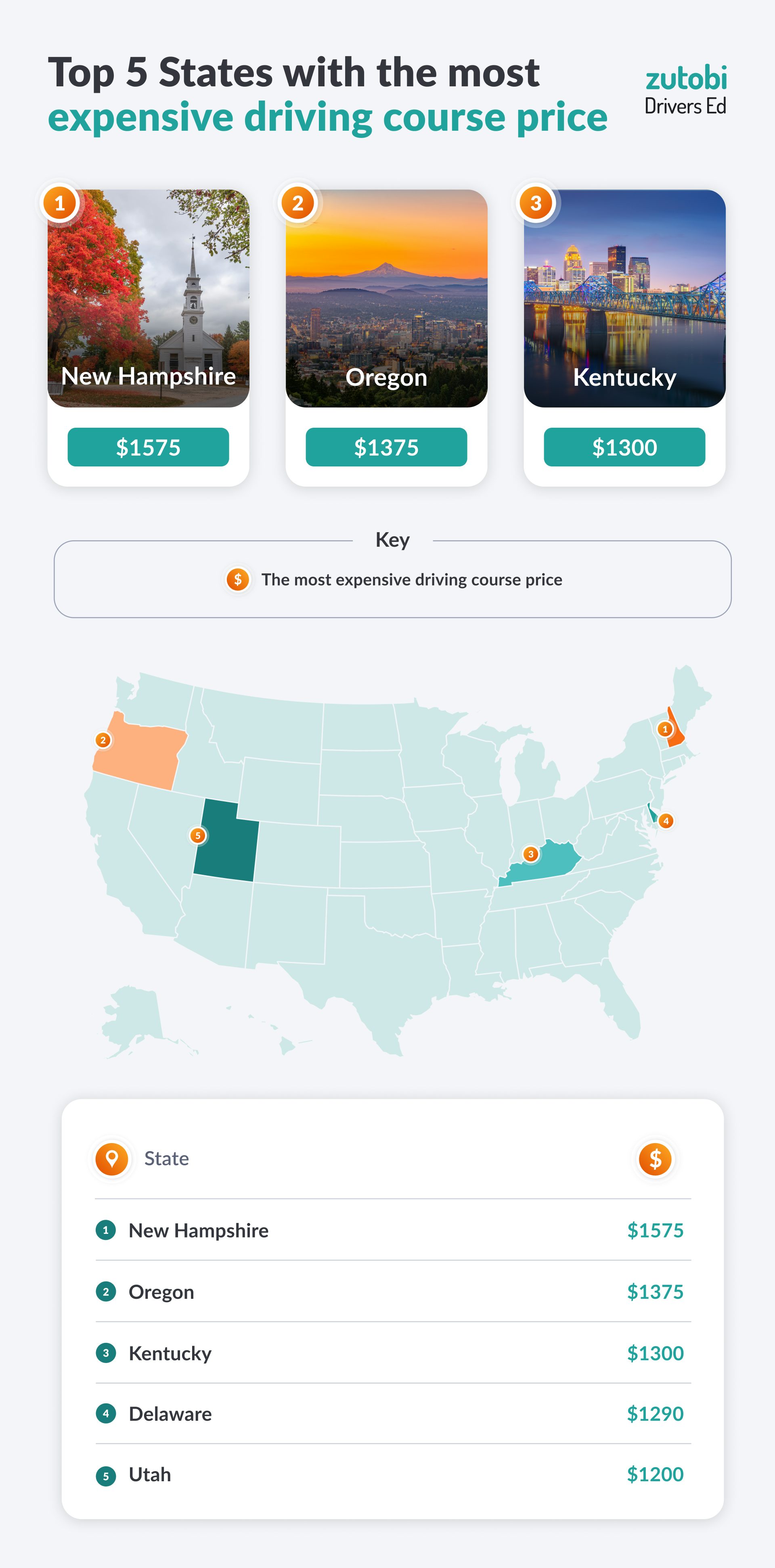 New Hampshire ranks as the most expensive state for driving education, primarily due to its higher per-hour charge for practical lessons at $130 and a theory class fee of $275. Totaling $1,575 for 10 hours of driving, the state’s approach reflects its commitment to providing top-tier education, albeit at a premium price.