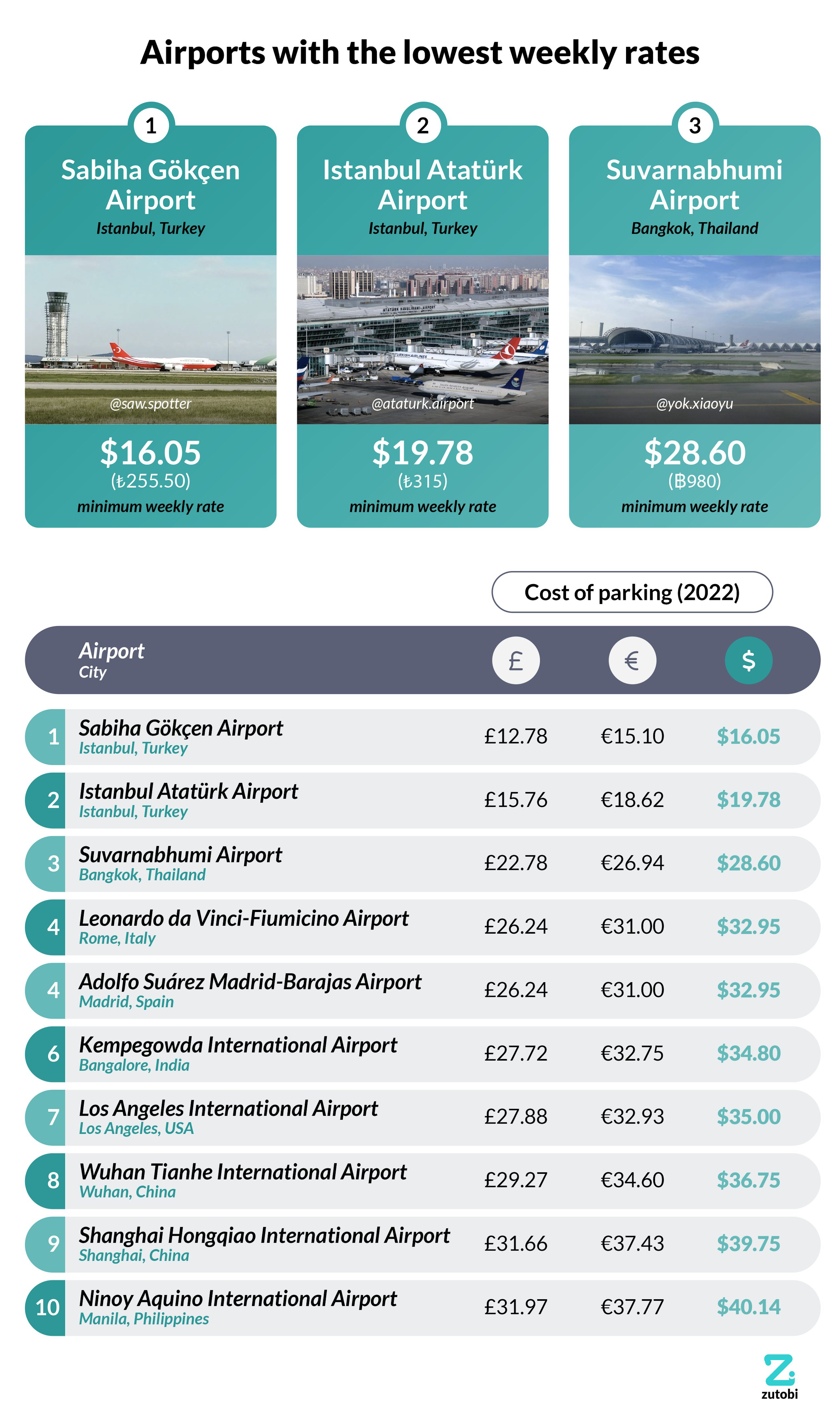 The airport with the lowest daily parking rate is Sabiha Gökçen Airport in Istanbul, where a full week’s parking can cost as little as $16.05. That’s $16 very well spent, as weekly parking rates vary wildly depending on the airport and where you park.