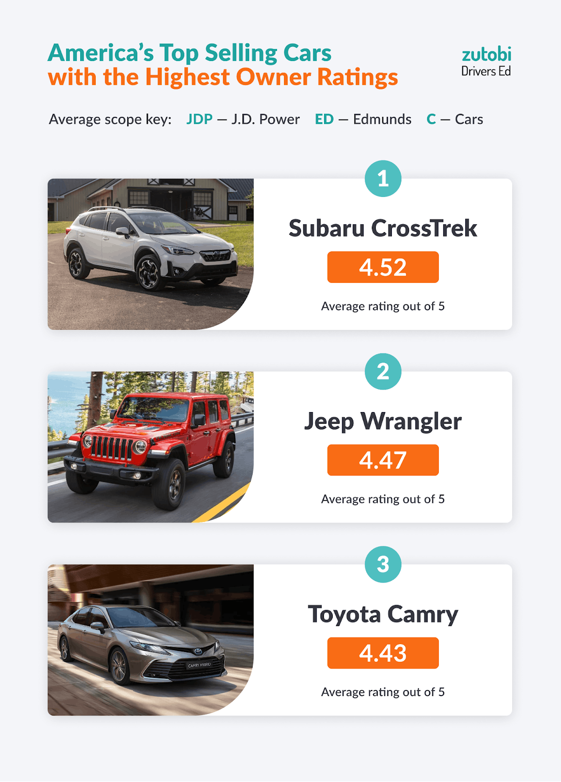 At the top of our list this year in the United States is the Subaru Crosstrek. On average, real world drivers rate this vehicle at a whopping 4.52 across all three sites. Owners on Car.com rated the Subaru Crosstrek at an impressive 4.8 while those sharing their experiences on J.D. Power and Edmunds awarded ratings of 4.6 and 4.15 respectively.
