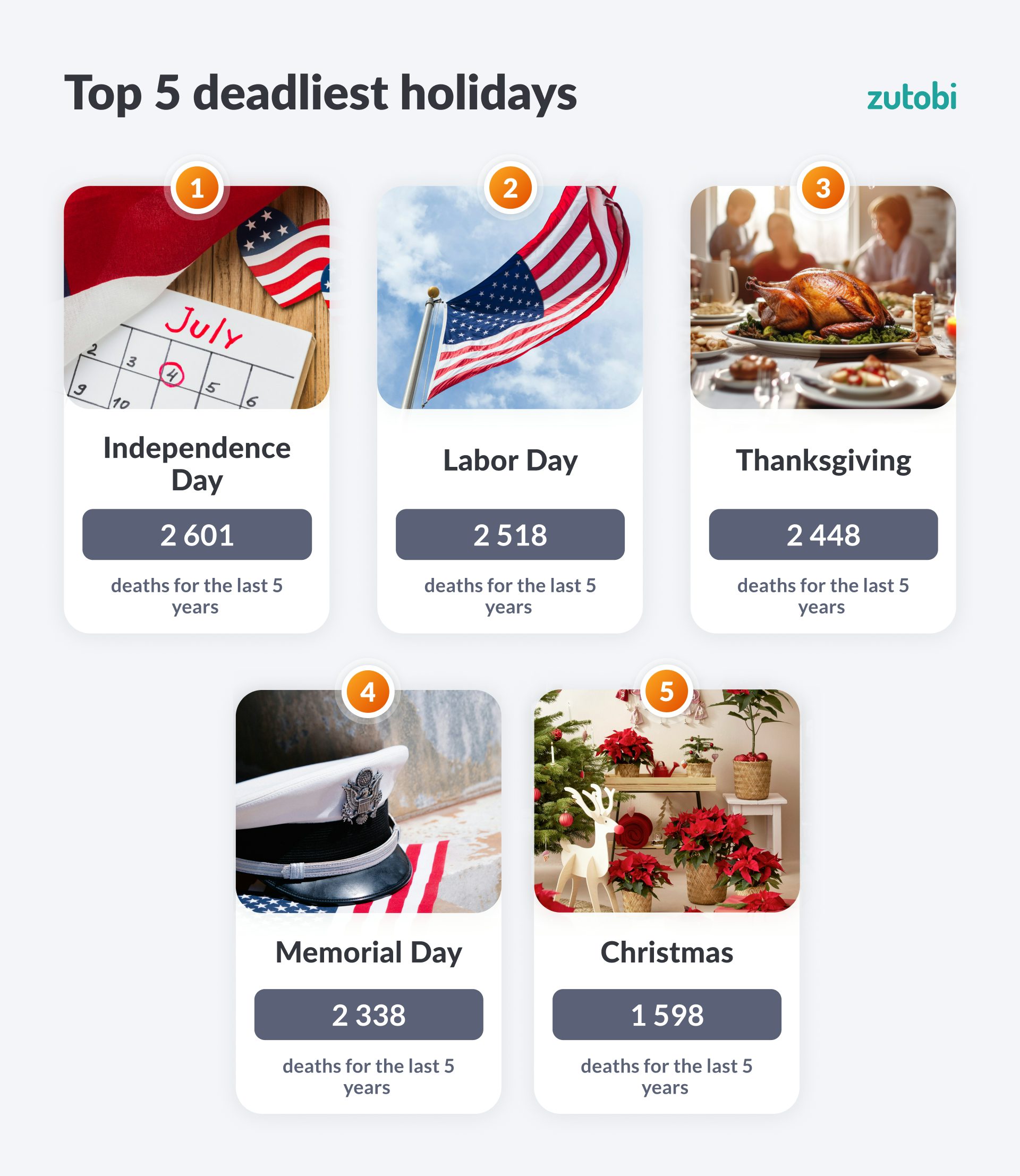 At Zutobi, we believe in the power of safe driving education and staying informed. In this report, we present the ranking of America’s most dangerous holidays on the road, based on meticulous analysis of statistics on DUI, speeding, distracted driving, and inexperience. We ranked each holiday from best to worst based on statistics from the past five years.