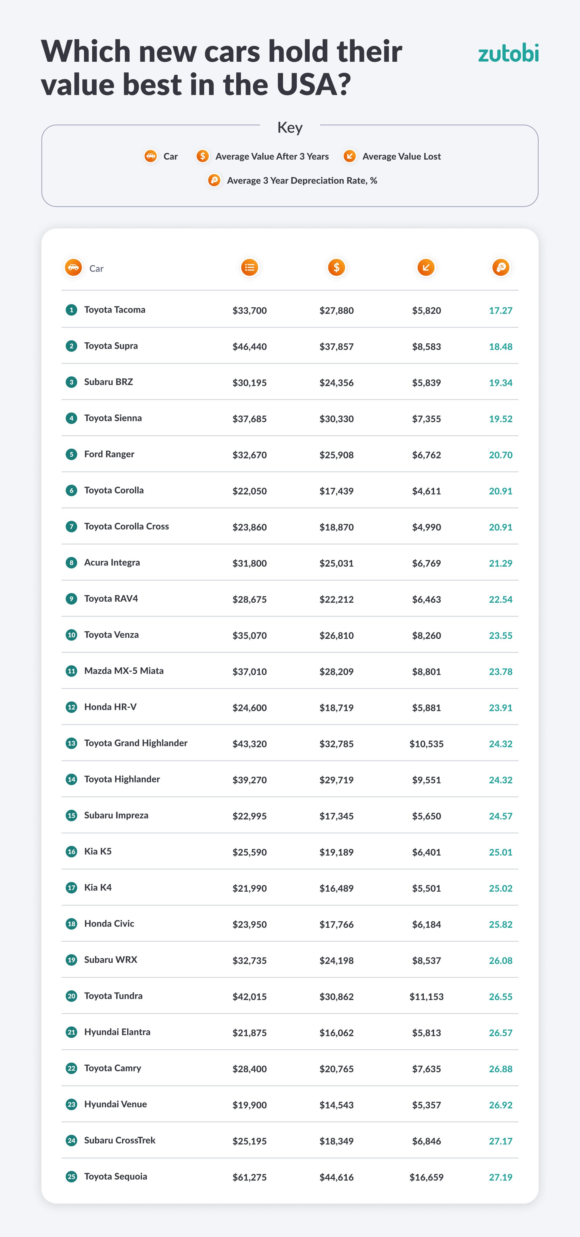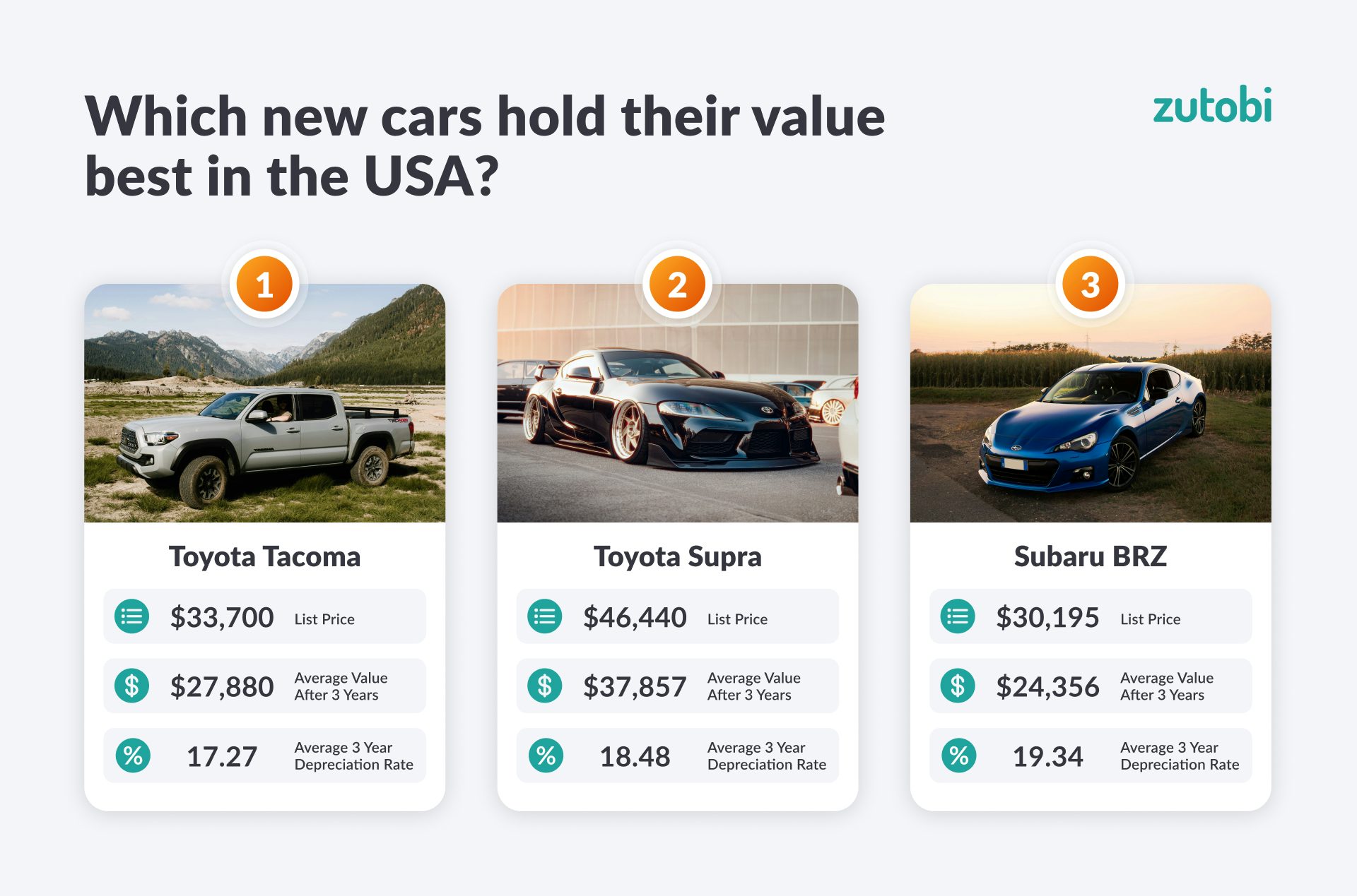 The car which holds its value best in the United States is the Toyota Tacoma pickup truck; this Japanese truck has been on sale since the mid-1990s. Toyota pickup trucks have a reputation for bulletproof reliability and sturdiness, and consequently, after three years they could be almost as good as new, resulting in a small drop in value.