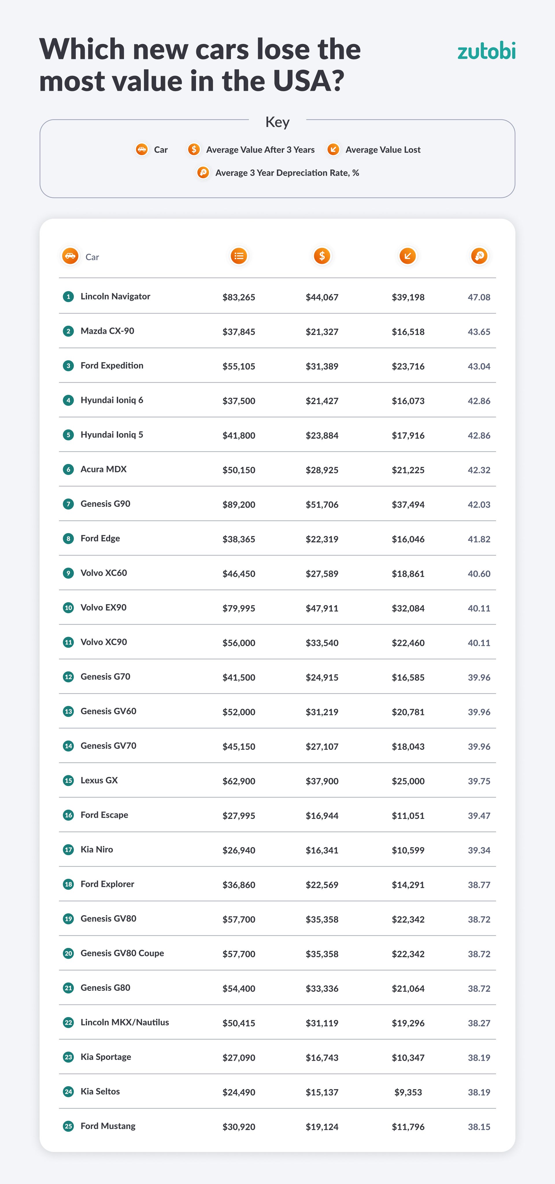 The Lincoln Navigator is a full-size luxury SUV that boasts a spacious interior, high-end materials, and advanced features. However, its high initial price tag and rapid advancements in the luxury SUV market contribute to its significant depreciation. While the Navigator is equipped with a powerful engine and cutting-edge technology, its value drops substantially within the first three years, making it a better deal for second-hand buyers than new car shoppers.